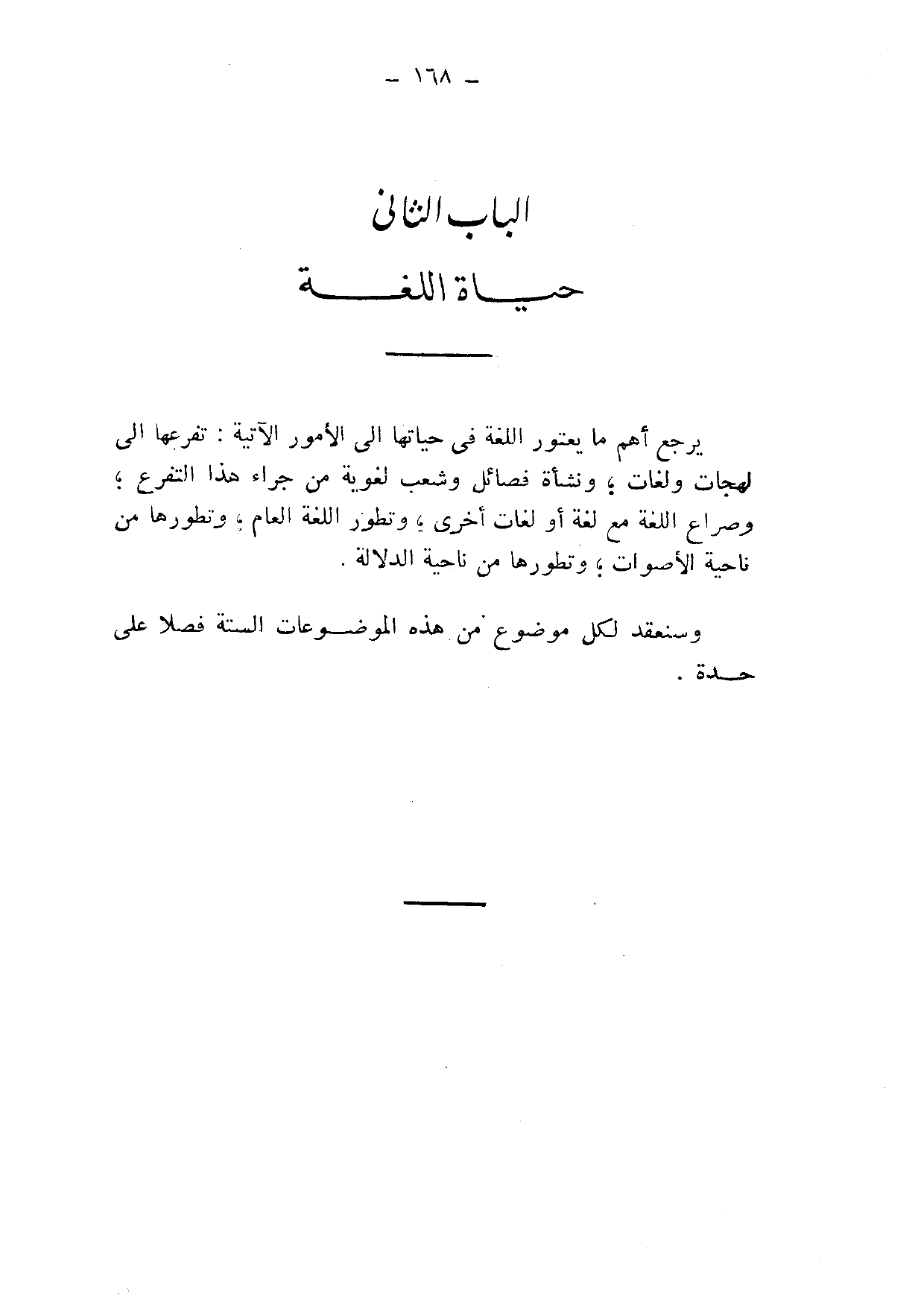 تفرعها إلى لهجات ولغات، ونشأة فصائل وشعب لغوية من جراء هذا التفرع، وصراع اللغة مع لغة أو لغات أخرى، وتطور اللغة العام، وتطورها من ناحية الأصوات، وتطورها من ناحية الدلالة.