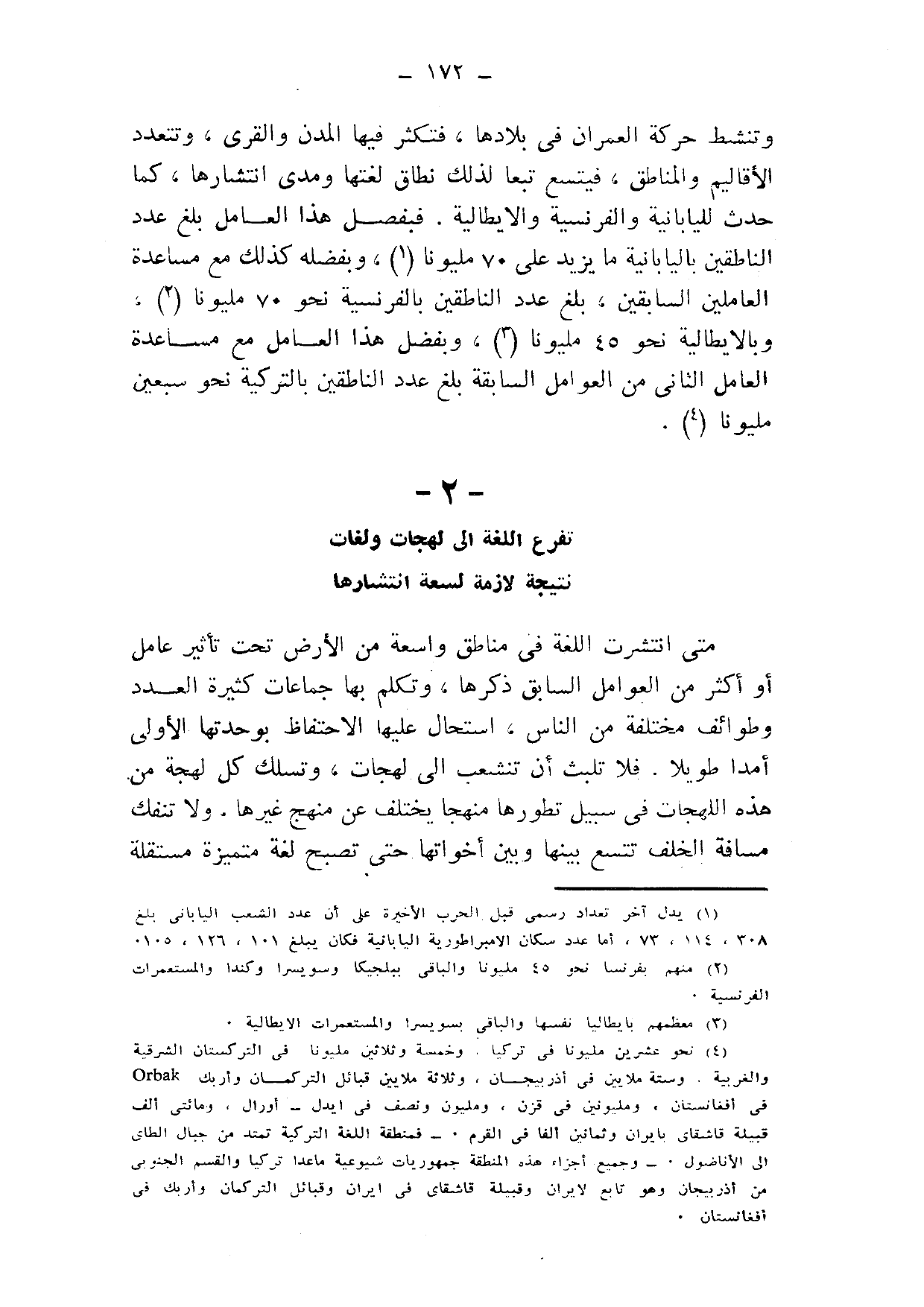 وتنشط حركة العمران في بلادها، فتكثر فيها المدن والقرى، وتتعدد الأقاليم والمناطق، فيتسع تبعًا لذلك نطاق لغتها ومدى انتشارها، كما حدث لليابانية والفرنسية والإيطالية؛ فبفضل هذا العامل بلغ عدد الناطقين باليابانية ما يزيد على 70 مليونًا1، وبفضله كذلك مع مساعدة العاملين السابقين، بلغ عدد الناطقين بالفرنسية نحو 70 مليونًا2، وبالإيطالية نحو 45 مليونًا3، وبفضل هذا العامل مع مساعدة العامل الثاني من العوامل السابقة, بلغ عدد الناطقين بالتركية نحو سبعين مليونًا4.
