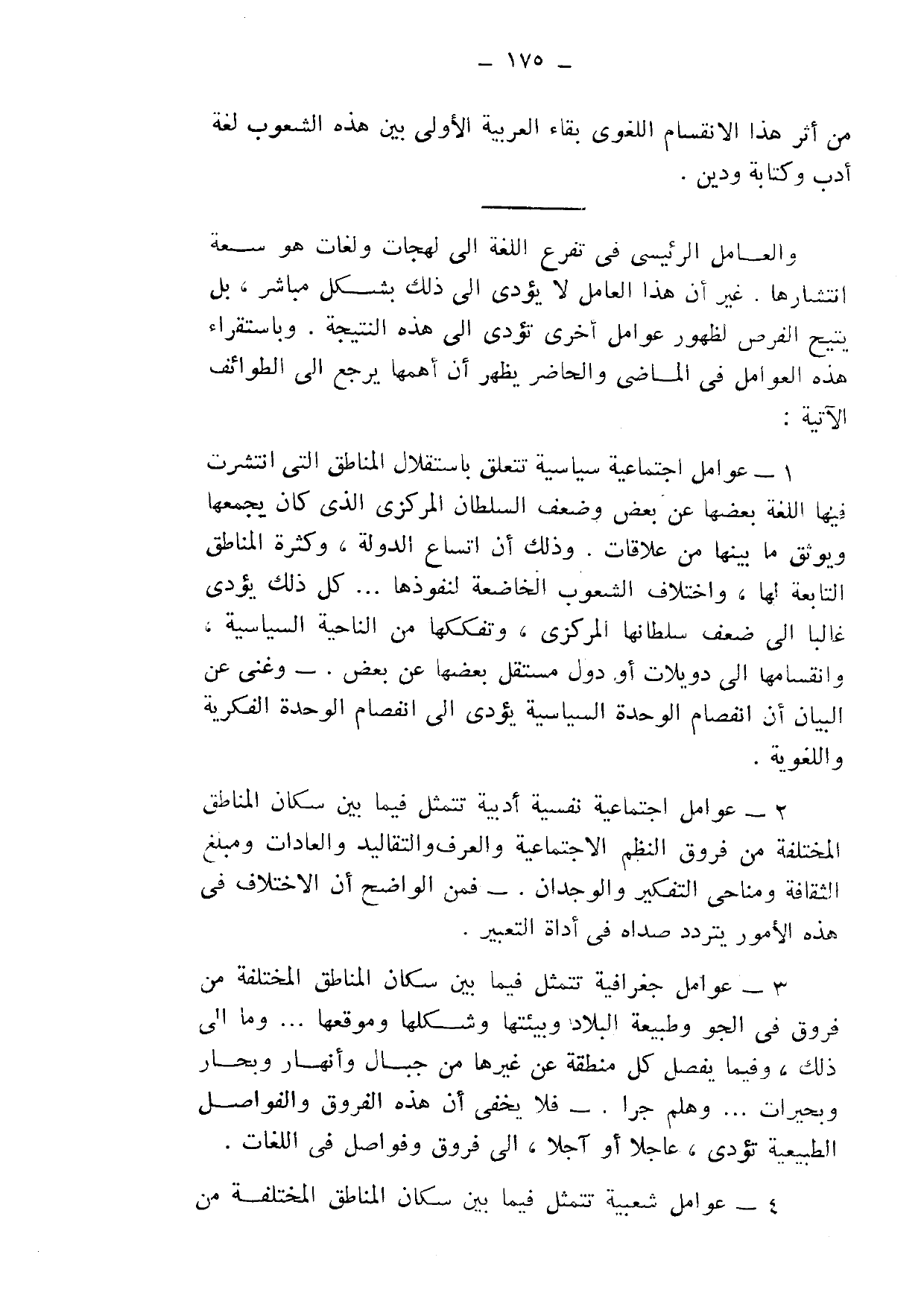 3- عوامل جغرافية: تتمثل فيما بين سكان المناطق المختلفة؛ من فروق في الجو وطبيعة البلاد وبيئتها وشكلها وموقعها ... وما إلى ذلك، وفيما يفصل كل منطقة عن غيرها من جبال وأنهار وبحار وبحيرات ... وهلم جرا. فلا يخفى أن هذه الفروق والفواصل الطبيعية تؤدي، عاجلًا أو آجلًا، إلى فروق وفواصل في اللغات.