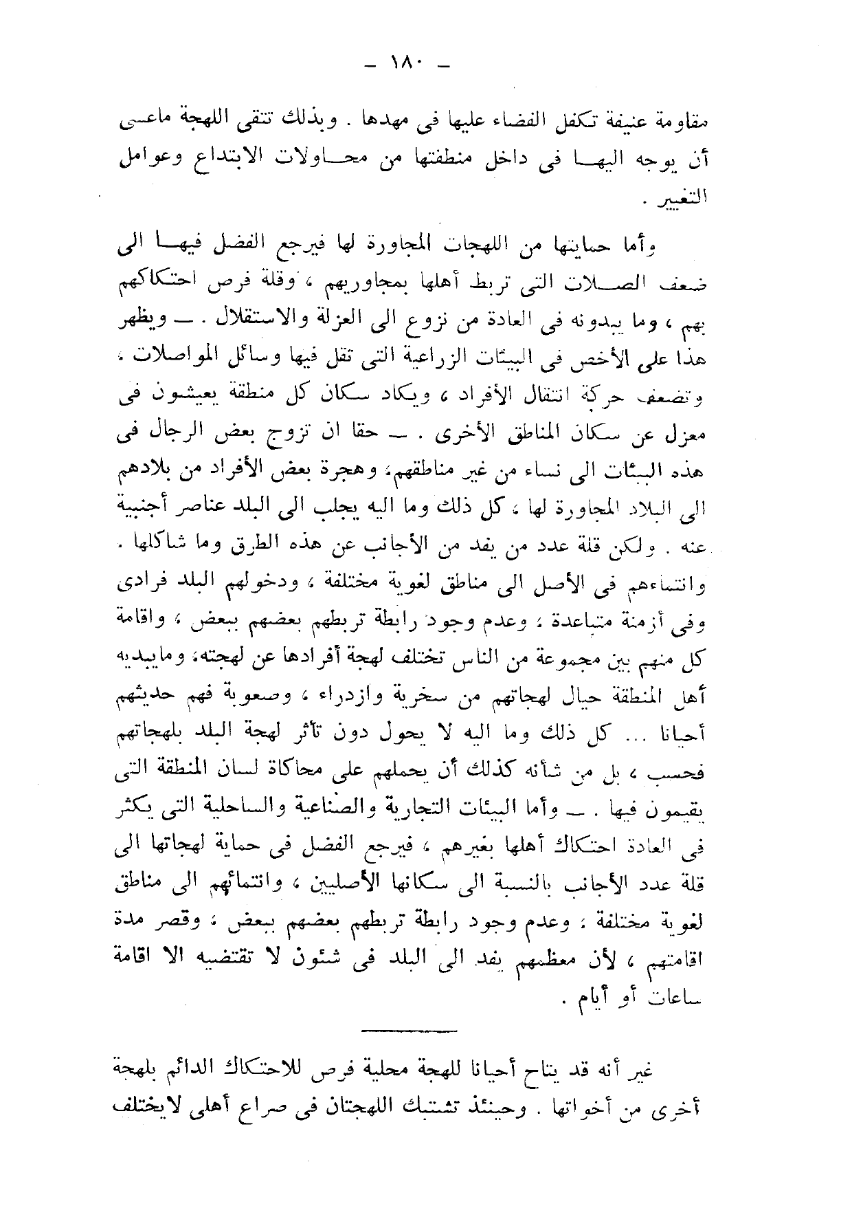 وأما حمايتها من اللهجات المجاورة لها, فيرجع الفضل فيها إلى ضعف الصلات التي تربط أهلها بمجاوريهم، وقلة فرص احتكاكهم بهم, وما يبدونه في العادة من نزوع إلى العزلة والاستقلال, ويظهر هذا على الأخص في البيئات الزراعية التي تقل فيها وسائل المواصلات, وتضعف حركة انتقال الأفراد، ويكاد سكان كل منطقة يعيشون في معزل عن سكان المناطق الأخرى. حقًّا أن تزوج بعض الرجال في هذه البيئات إلى نساء من غير مناطقهم، وهجرة بعض الأفراد من بلادهم إلى البلاد المجاورة لها، كل ذلك وما إليه يجلب إلى البلد عناصر أجنبية عنه, ولكن قلة عدد من يفد من الأجانب عن هذه الطرق وما شاكلها, وانتماءهم في الأصل إلى مناطق لغوية مختلفة، ودخولهم البلد فرادى, وفي أزمنة متباعدة، وعدم وجود رابطة تربطهم بعضهم ببعض، وإقامة كل منهم بين مجموعة من الناس تختلف لهجة أفرادها عن لهجته، وما يبديه أهل المنطقة حيال لهجاتهم من سخرية وازدراء، وصعوبة فهم حديثهم أحيانًا ... كل ذلك وما إليه لا يحول دون تأثر لهجة البلد بلهجاتهم فحسب، بل من شأنه كذلك أن يحملهم على محاكاة لسان المنطقة التي يقيمون فيها, وأما البيئات التجارية والصناعية والساحلية التي يكثر في العادة احتكاك أهلها بغيرهم، فيرجع الفضل في حماية لهجاتها إلى قلة عدد الأجانب بالنسبة إلى سكانها الأصليين، وانتمائهم إلى مناطق لغوية مختلفة، وعدم وجود رابطة تربطهم بعضهم ببعض، وقصر مدة إقامتهم؛ لأن معظمهم يفد إلى البلد في شئون لا تقتضيه إلّا إقامة ساعات أو أيام.