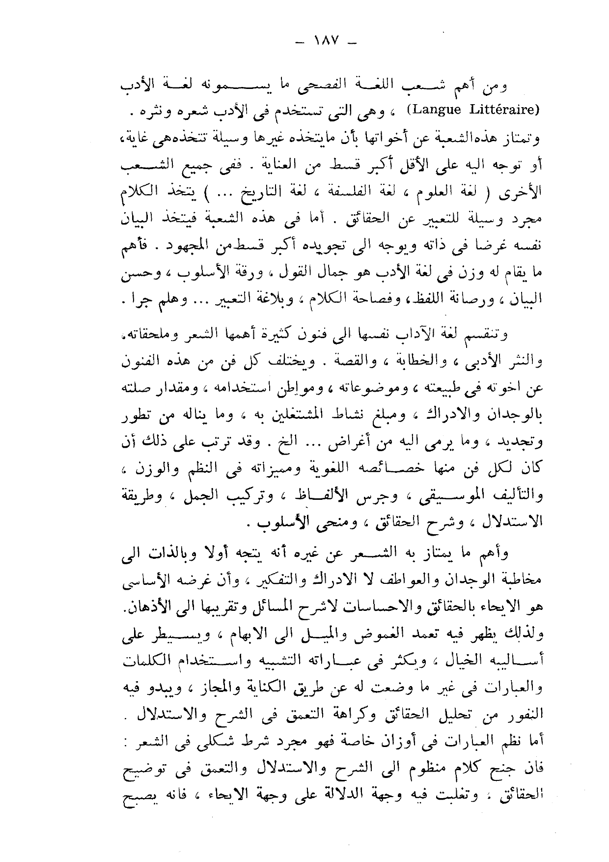 ومن أهم شعب اللغة الفصحى ما يسمونه لغة الأدب "Langue Litteraire"، وهي التي تستخدم في الأدب شعره ونثره, وتمتاز هذه الشعبة عن أخواتها بأن ما يتخذه غيرها وسيلة تتخذه هي غاية، أو توجه إليه على الأقل أكبر قسط من العناية؛ ففي جميع الشعب الأخرى "لغة العلوم، لغة الفلسفة، لغة التاريخ ... " يتخذ الكلام مجرد وسيلة للتعبير عن الحقائق, أما في هذه الشعبة فيتخذ البيان نفسه غرضًا في ذاته, ويوجه إلى تجويده أكبر قسط من المجهود, فأهم ما يقام له وزن في لغة الأدب هو جمال القول، ورقة الأسلوب، وحسن البيان، ورصانة اللفظ، وفصاحة الكلام، وبلاغة التعبير ... وهلم جرَّا.