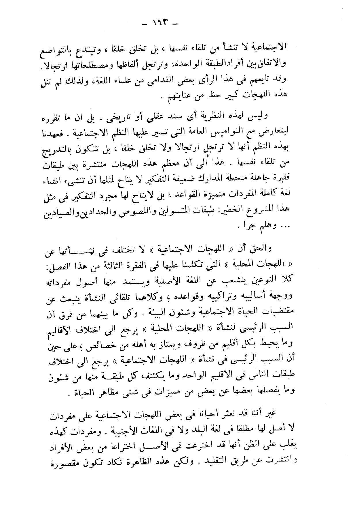 والحق أن "اللهجات الاجتماعية" لا تختلف في نشأتها عن "اللهجات المحلية" التي تكلمنا عليها في الفقرة الثالثة من هذا الفصل, كلا النوعين ينشعب عن اللغة الأصلية, ويستمد منها أصول مفرداته ووجهة أساليبه وتراكيبه وقواعده، وكلاهما تلقائي النشأة ينبعث عن مقتضيات الحياة الاجتماعية وشئون البيئة. وكل ما بينهما من فرق أن السبب الرئيسي لنشأة "اللهجات المحلية" يرجع إلى اختلاف الأقاليم وما يحيط بكل إقليم من ظروف, ويمتاز به أهله من خصائص، على حين أن السبب الرئيسي في نشأة "اللهجات الاجتماعية" يرجع إلى اختلاف طبقات الناس في الإقليم الواحد, وما يكتنف كل طبقة منها من شئون, وما يفصلها بعضها عن بعض من مميزات في شتى مظاهر الحياة.