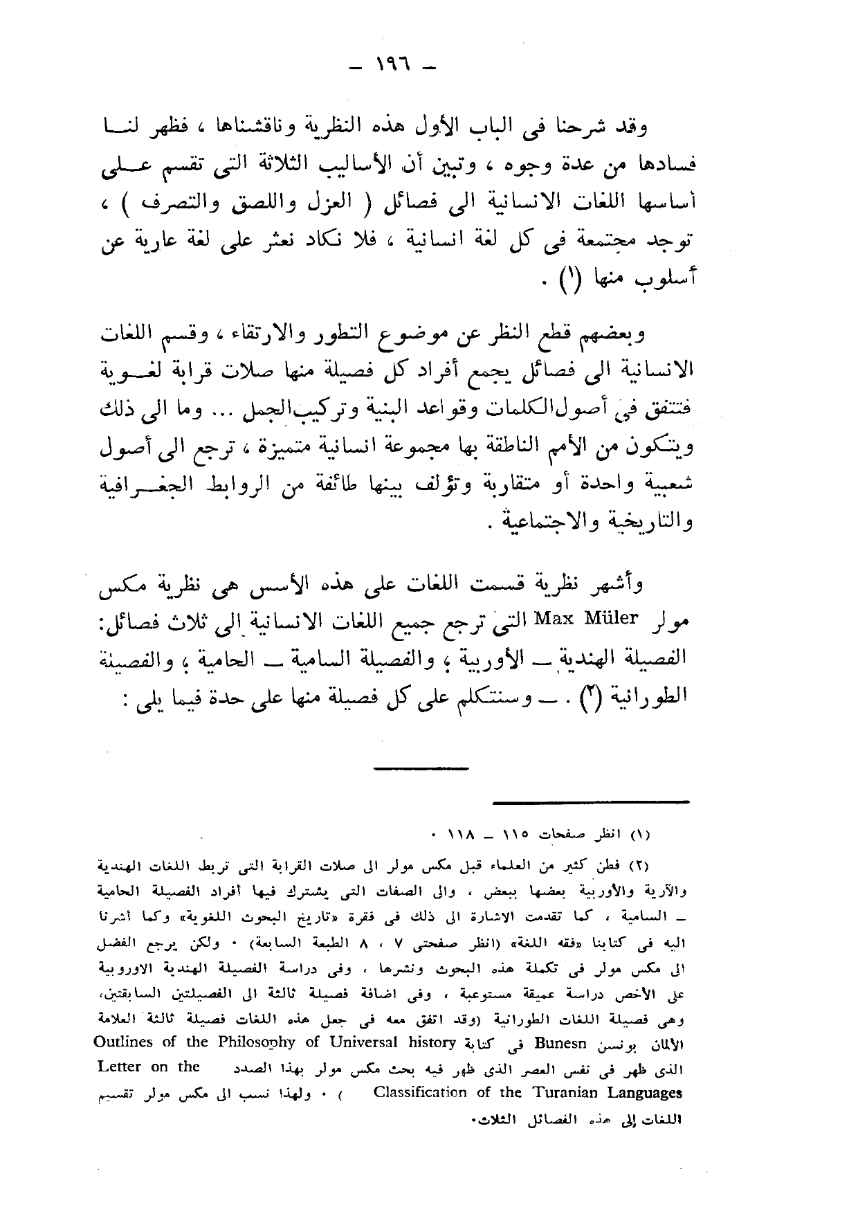 2 فطن كثير من العلماء قبل مكس مولر إلى صلات القرابة التي تربط اللغات الهندية والآرية والأوربية بعضها ببعض, وإلى الصفات التي يشترك فيها أفراد الفصيلة الحامية-السامية. كما تقدمت الإشارة إلى ذلك في فقرة "تاريخ البحوث اللغوية"، وكما أشرنا إليه في كتابنا "فقه اللغة". انظر صفحتي 7، 8 الطبعة السابعة. ولكن يرجع الفضل إلى مكس مولر في تكملة هذه البحوث ونشرها، وفي دراسة الفصيلة الهندية الأوروبية على الأخص دراسة عميقة مستوعبة، وفي إضافة فصيلة ثالثة إلى الفصيلتين السابقتين، وهي فصيلة اللغات الطورانية, وقد اتفق معه في جعل هذه اللغات فصيلة ثالثة العلامة الألمان بونسن Bunesn في كتابه "Outlines of the Philosophy of Universal history, الذي ظهر في نفس العصر الذي ظهر فيه بحث مكس مولر بهذا الصدد Classification of the Turanian Laguages Lerrer on the. ولهذا نسب إلى مكس مولر تقسيم اللغات إلى هذه الفصائل الثلاث.