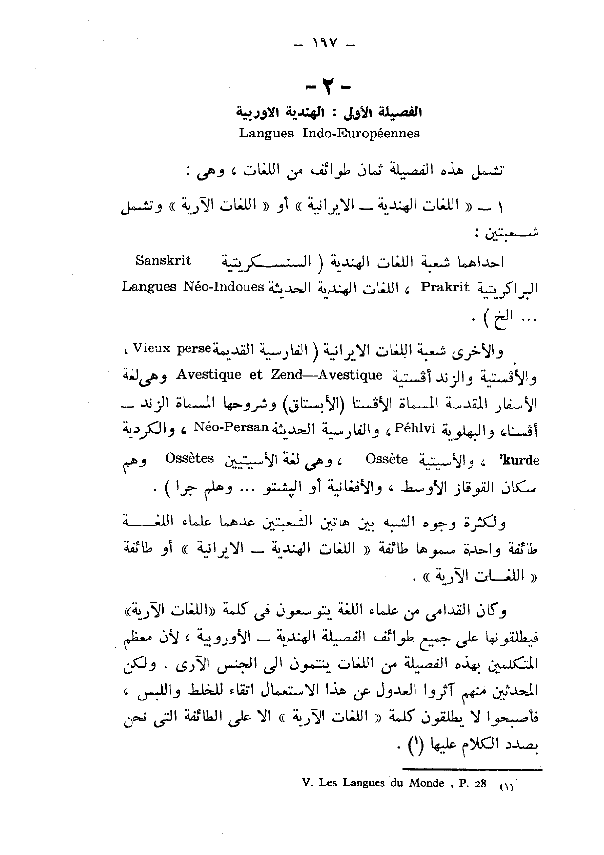والأخرى شعبة اللغات الإيرانية "الفارسية القديمة Vieux perse والأفستية, والزند أفستية Avestique et zend-Avestique, وهي لغة الأسفار المقدسة المسماة الأفستا "الأبستاق", وشروحها المسماة الزند -أفستا، والبهلوية Pehlvi، والفارسية الحديثة Neo-Persan، والكردية Kurde، والأسيتية Ossete، وهي لغة الأسيتيين Ossetes, وهم سكان القوقاز الأوسط، والأفغانية أو البشتو ... وهلم جرا".