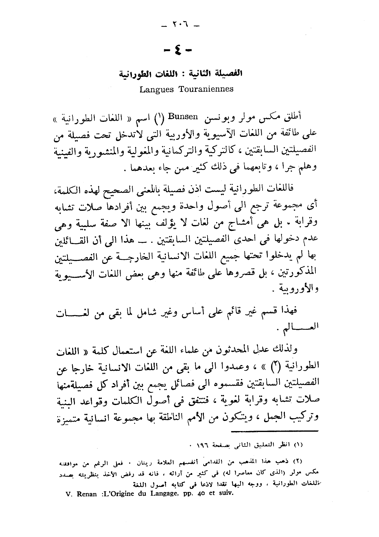 2 ذهب هذا المذهب من القدامى أنفسهم العلامة رينان؛ فعلى الرغم من موافقته مكس مولر -الذي كان معاصرًا له- في كثير من آرائه، فإنه قد رفض الأخذ بنظريته بصدد اللغات الطورانية، ووجه إليها نقدًا لاذعًا في كتابه أصول اللغة.