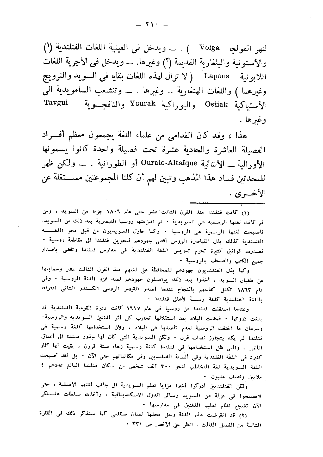 لنهر الفولجا Volga", ويدخل في الفينية اللغات الفنلندية1 والأستونية والبلغارية القديمة2 وغيرها, ويدخل في الأجرية اللغات اللابونية Lapons -لا تزال لهذه اللغات بقايا في السويد والنرويج وغيرهما, واللغات الهنغارية.. وغيرها, وتنشعب السامويدية إلى الأستياكية Ostiak واليوراكية Yourak والتافجوية Tavgui وغيرها.