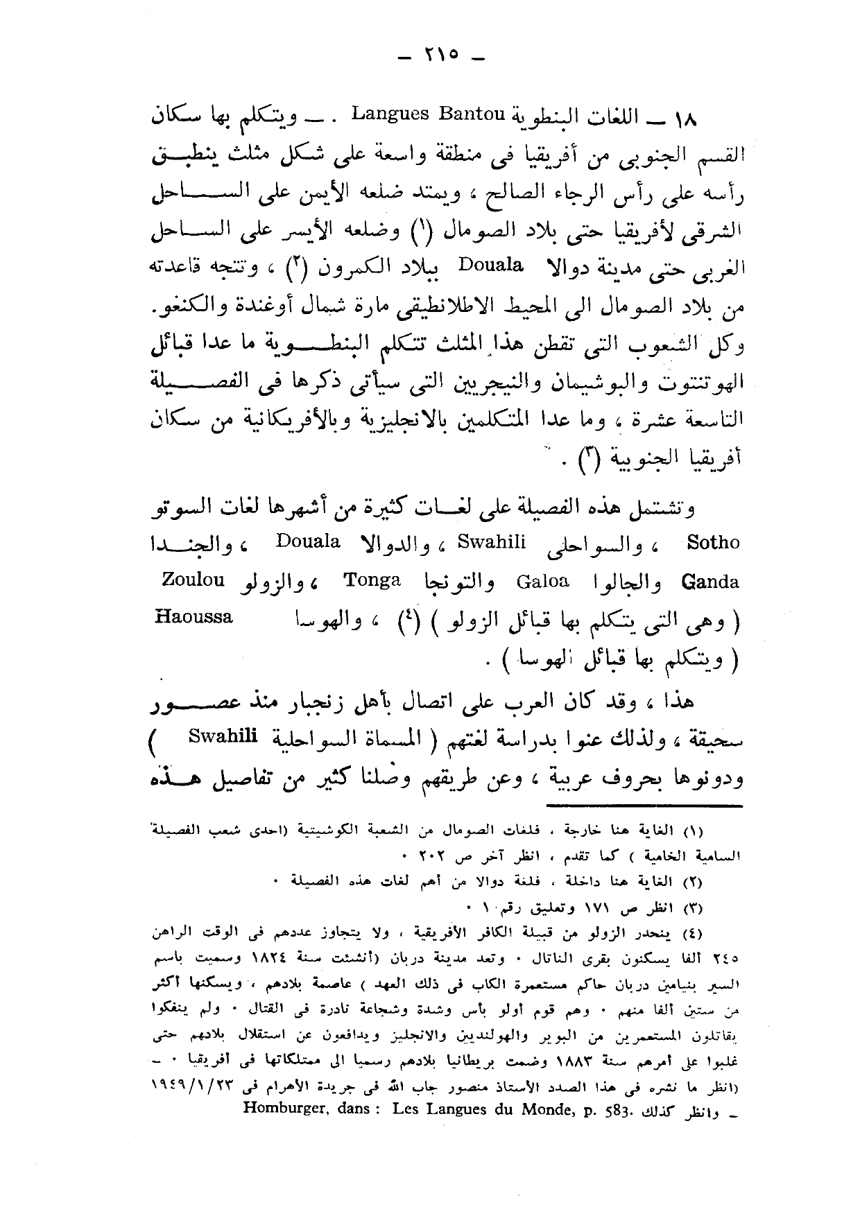 18- اللغات البنطوية Langues Bantou, ويتلكم بها سكان القسم الجنوبي من أفريقيا, في منطقة واسعة على شكل مثلث ينطبق رأسه على رأس الرجاء الصالح، ويمتد ضلعه الأيمن على الساحل الشرقي لأفريقيا حتى بلاد الصومال1, وضلعه الأيسر على الساحل الغربي حتى مدينة دوالا Douala ببلاد الكمرون2، وتتجه قاعدته من بلاد الصومال إلى المحيط الأطلانطيقي مارّةً شمال أوغندة والكنغو, وكل الشعوب التي تقطن هذا المثلث تتكلم البنطوية, ما عدا قبائل الهوتنتوت والبوشيمان والنيجريين, التي سيأتي ذكرها في الفصيلة التاسعة عشرة، وما عدا المتكلمين بالإنجليزية وبالأفريكانية من سكان أفريقيا الجنوبية3.