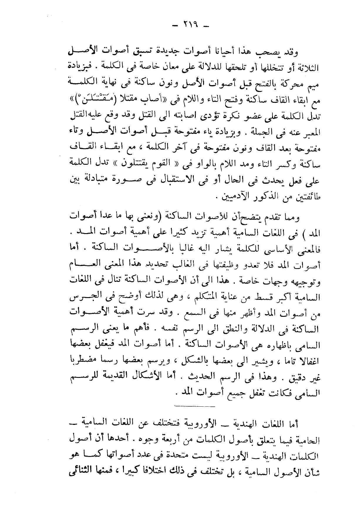 ومما تقدَّم يتضح أن للأصوات الساكنة -ونعني بها ما عدا أصوات المد- في اللغات السامية أهمية تزيد كثيرًا على أهمية أصوات المد؛ فالمعنى الأساسي للكلمة يشار إليه غالبًا بالأصوات الساكنة, أما أصوات المد فلا تعدو وظيفتها في الغالب تحديد هذا المعنى العام, وتوجيهه وجهات خاصة, هذا إلى أن الأصوات الساكنة تنال في اللغات السامية أكبر قسط من عناية المتكلم، وهي لذلك أوضح في الجرس من أصوات المد وأظهر منها في السمع, وقد سرت أهمية الأصوات الساكنة في الدلالة والنطق إلى الرسم نفسه, فأهم مايعنى الرسم السامي بإظهاره هي الأصوات الساكنة, أما أصوات المد فيغفل بعضها إغفالًا تامًّا، ويشير إلى بعضها بالشكل، ويرسم بعضها رسمًا مضطربًا غير دقيق, وهذا في الرسم الحديث. أما الأشكال القديمة للرسم السامي فكانت تغفل جميع أصوات المد.