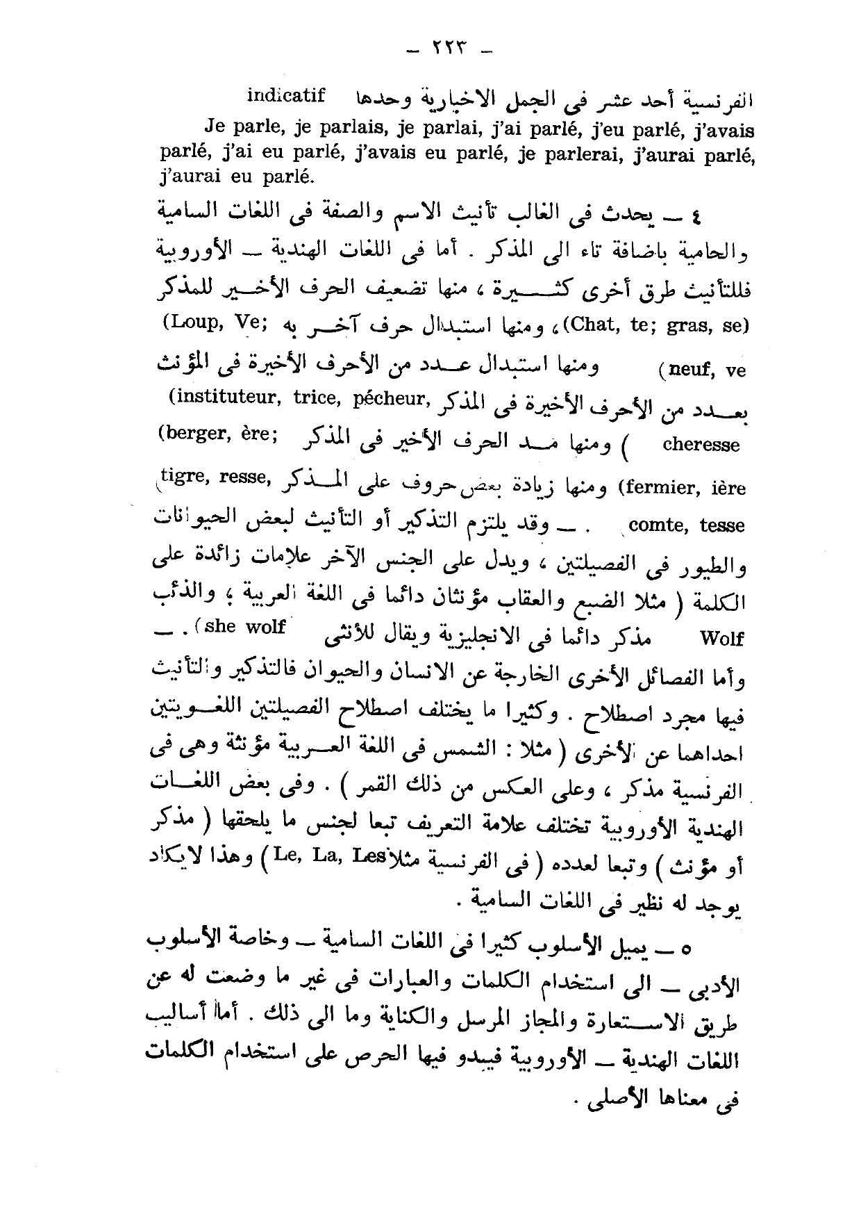 4- يحدث في الغالب تأنيث الاسم والصفة في اللغات السامية والحامية بإضافة تاء إلى المذكر, أما في اللغات الهندية - الأوروبية فللتأنيث طرق أخرى كثيرة، منها تضعيف الحرف الأخير للمذكر "Chat, te; gras se"، ومنها استبدال حرف آخر به Loup, Ve; neuf, ve ومنها استبدال عدد من الأحرف الأخيرة في المؤنث بعدد من الأحرف الأخيرة في المذكر "instituteur, trice, pecheur, cheresse" ومنها مد الحرف الأخير في المذكر "berger, ere; fermier, iere" ومنها زيادة بعض حروف على المذكر tigre, resse, fermier, iere" ومنها زيادة بعض حروف على المذكر tigre, resse, comte tesse0- وقد يلتزم التذكير أو التأنيث لبعض الحيوانات والطيور في الفصيلتين، ويدل على الجنس الآخر علامات زائدة على الكلمة "مثلًا الضبع والعقاب مؤنثان دائمًا في اللغة العربية، والذئب Wolf مذكر دائمًا في الإنجليزية ويقال للأنثى she wolf00- وأما الفصائل الأخرى الخارجة عن الإنسان والحيوانات فالتذكير والتأنيث فيها مجرد اصطلاح, وكثيرًا ما يختلف اصطلاح الفصيلتين اللغويتين إحداهما عن الأخرى "مثلًا: الشمس في اللغة العربية مؤنثة, وهي في الفرنسية مذكر، وعلى العكس من ذلك القمر". وفي بعض اللغات الهندية الأوروبية تختلف علامة التعريف تبعًا لجنس ما يلحقها "مذكر أو مؤنث" وتبعا لعدده "في الفرنسية مثلًا Le, La, Les " وهذا لا يكاد يوجد له نظير في اللغات السامية.