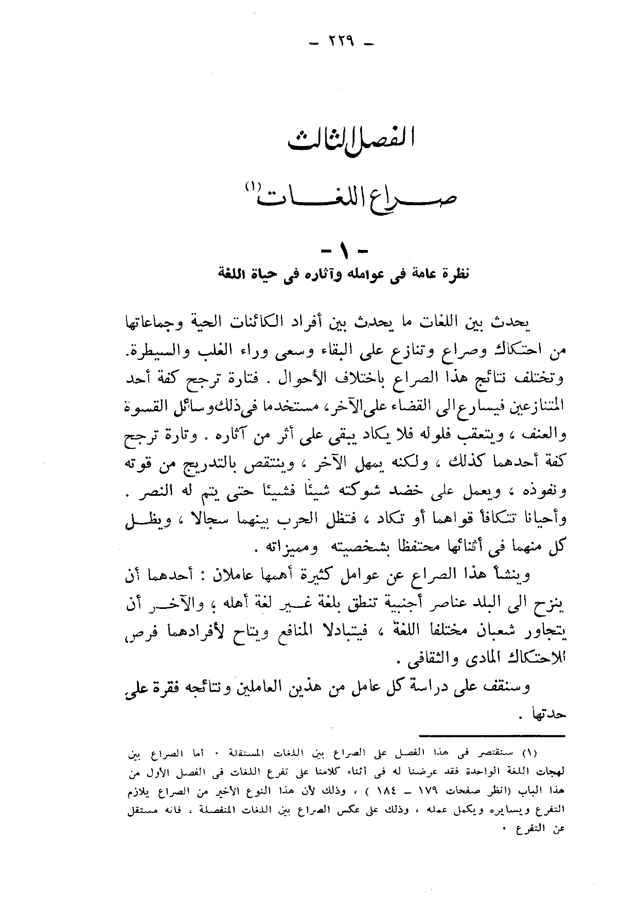 1 سنقتصر في هذا الفصل على الصراع بين اللغات المستقلة, أما الصراع بين لهجات اللغة الواحدة فقد عرضنا له في أثناء كلامنا على تفرع اللغات في الفصل الأول من هذا الباب. "انظر صفحات 179-184"، وذلك لأن هذا النوع الأخير من الصراع يلازم التفرع ويسايره ويكمل عمله، وذلك على عكس الصراع بين اللغات المنفصلة، فإنه مستقل عن التفرع.