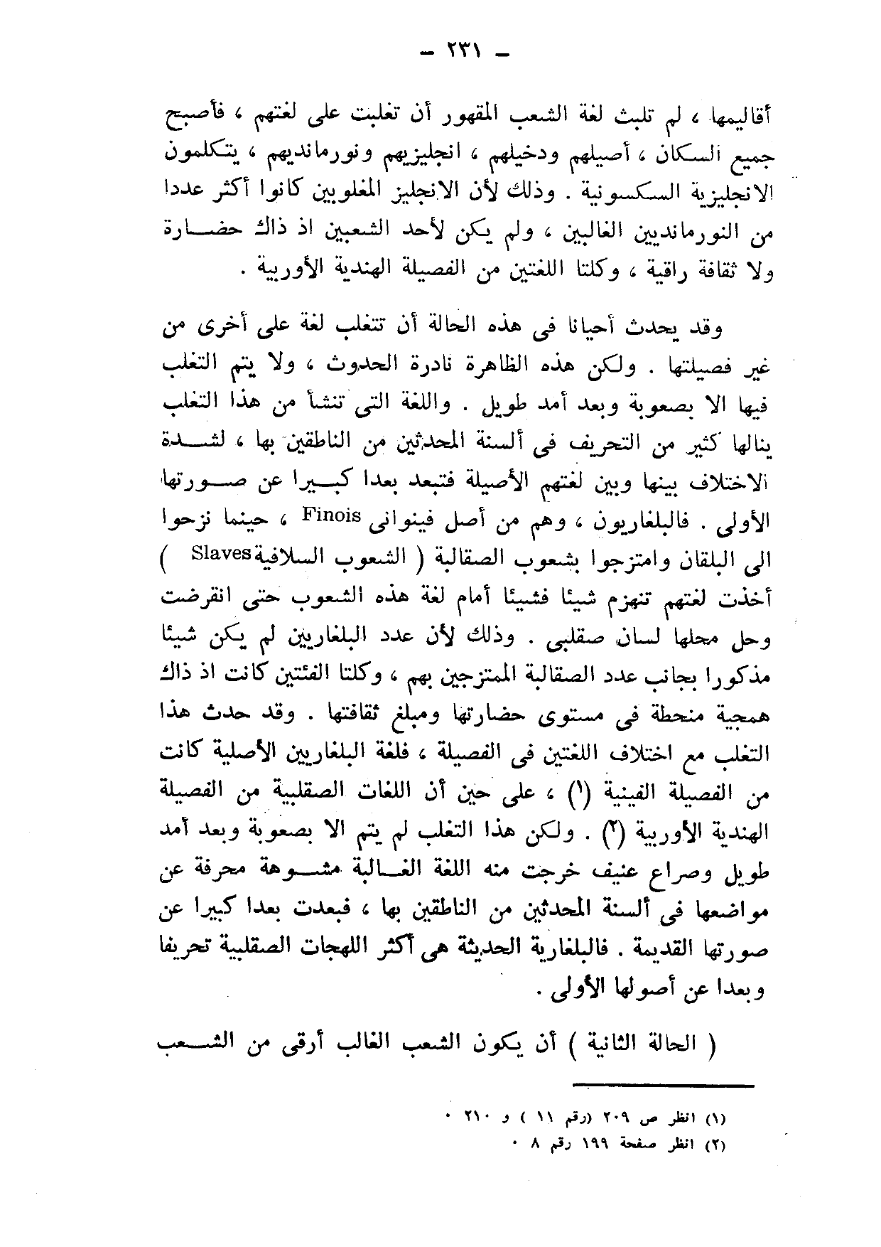 وقد يحدث أحيانًا في هذه الحالة أن تتغلب لغة على أخرى من غير فصيلتهما, ولكن هذه الظاهرة نادرة الحدوث، ولا يتم التغلب فيها إلّا بصعوبة, وبعد أمد طويل, واللغة التي تنشأ من هذا التغلب ينالها كثير من التحريف في ألسنة المحدثين من الناطقين بيها، لشدة الاختلاف بينها وبين لغته الأصيلة؛ فتبعد بعدًا كبيرًا عن صورتها الأولى؛ فالبلغاريون، وهم من أصل فينواني Finois، حينما نزحوا إلى البلقان وامتزجوا بشعوب الصقالبة "الشعوب السلافية Slaves" أخذت لغتهم تنهز شيئًا فشيئًا أمام لغة هذه الشعوب حتى انقرضت وحلَّ ملحا لسان صقلبي, وذلك لأن عدد البلغاريين لم يكن شيئًا مذكورًا بجانب عدد الصقالبة الممتزجين بهم، وكلتا الفئتين كانت إذ ذاك همجية منحطة في مستوى حضارتها ومبلغ ثقافتها, وقد حدث هذا التغلب مع اختلاف اللغتين في الفصيلة، فلغة البلغاريين الأصلية كانت من الفصيلة الفينية1، على حين أن اللغات الصقلبية من الفصيلة الهندية الأوربية2, ولكن هذا التغلب لم يتم إلّا بصعوبة, وبعد أمد طويل وصراع عنيف, خرجت منه اللغة الغالبة مشوهة محرفة عن مواضعها في ألسنة المحدثين من الناطقين بها، فبعدت بعدًا كبيرًا عن صورتها القديمة؛ فالبلغارية الحديثة هي أكثر اللهجات الصقلبية تحريفًا وبعدًا عن أصولها الأولى.