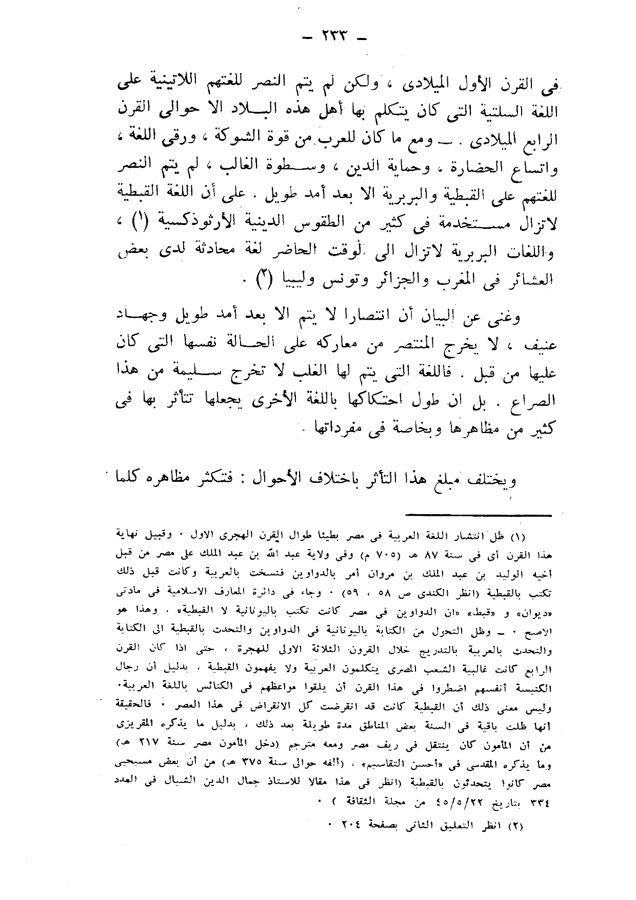 1 ظل انتشار اللغة العربية في مصر بطيئًا طوال القرن الهجري الأول, وقبيل نهاية هذا القرن "أي في سنة 87هـ-705م" وفي ولاية عبد الله بن عبد الملك على مصر من قِبَلِ أخيه الوليد بن عبد الملك بن مروان أمر بالدواوين فنسخت بالعربية, وكانت قبل ذلك تكتب بالقبطية "انظر الكندي ص58، 59". وجاء في دائرة المعارف الإسلامية في مادتي "ديوان" و"قبط" "إن الدواوين في مصر كانت تكتب باليونانية لا القبطية" وهذا هو الأصح, وظل التحول من الكتابة باليونانية في الدواوين والتحدث بالقبطية إلى الكتابة والتحدث بالعربية بالتدريج خلال القرون الثلاثة الأولى للهجرة، حتى إذا كان القرن الرابع كانت غالبية الشعب المصري يتكلمون العربية ولا يفهمون القبطية، بدليل أن رجال الكنيسة أنفسهم اضطروا في هذا القرن أن يلقوا مواعظهم في الكنائس باللغة العربية, وليس معنى ذلك أن القبطية كانت قد انقرضت كل الانقراض في هذا العصر؛ فالحقيقة أنها ظلت باقية في السنة بعض المناطق مدة طويلة بعد ذلك، بدليل ما يذكره المقريزي من أن المأمون كان ينتقل من ريف مصر ومعه مترجم "دخل المأمون مصر سنة 217هـ" وما يذكره المقدسي في "أحسن التقاسيم"، "ألفه حوالي سنة 375هـ" من أن بعض مسيحي مصر كانوا يتحدثون بالقبطية "انظر في هذا مقالًا للأستاذ جمال الدين الشيال في العدد 334 بتاريخ 22/ 5/ 45 من مجلة الثقافة".