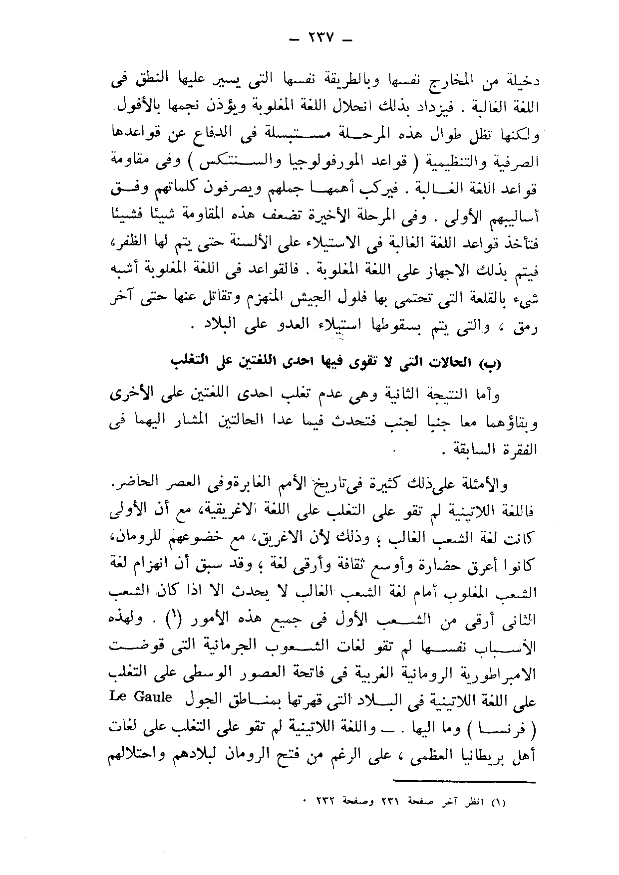 والأمثلة على ذلك كثيرة في تاريخ الأمم الغابرة وفي العصر الحاضر, فاللغة اللاتينية لم تقو على التغلب على اللغة الإغريقية، مع أن الأولى كانت لغة الشعب الغالب، وذلك لأن الإغريق، مع خضوعهم للرومان، كانوا أعرق حضارة وأوسع ثقافة وأرقى لغة، وقد سبق أن انهزام لغة الشعب المغلوب أمام لغة الشعب الغالب لا يحدث إذا كان الشعب الثاني أرقى من الشعب الأول في جميع هذ الأمور1. ولهذه الأسباب نفسها لم تقو لغات الشعوب الجرمانية التي قوضت الإمبراطورية الرومانية الغربية في فاتحة العصور الوسطى على التغلب على اللغة اللاتينية في البلاد التي قهرتها بمناطق الجول Le Gaule "فرنسا" وما إليها. واللغة اللاتينية لم تقو على التغلب على لغات أهل بريطانيا العظمى، على الرغم من فتح الرومان لبلادهم واحتلاهم