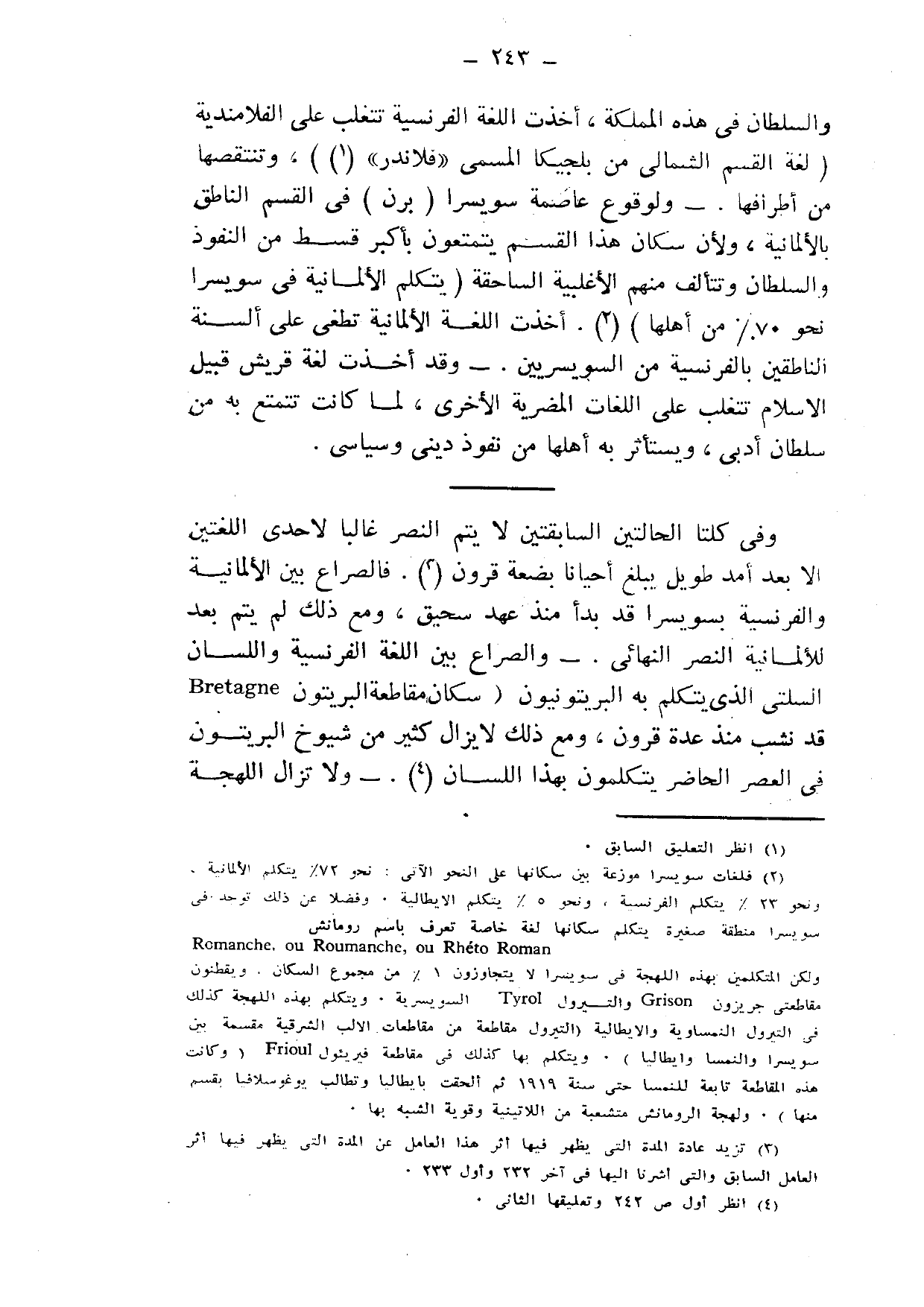 والسلطان في هذه المملكة، أخذت اللغة الفرنسية تتغلب على الفلامندية "لغة القسم الشمالي من بلجيا المسمى "فلاندر"1، وتنتقصها من أطرافها. ولوقوع عاصمة سويسرا "برن" في القسم الناطق بالألمانية، ولأن سكان هذا القسم يتمتعون بأكبر قسط من النفوذ والسلطان, وتتألف منهم الأغلبية الساحقة "يتكلم الألمانية في سويسرا نحو 70% من أهلها2, أخذت اللغة الألمانية تطغى على ألسنة الناطقين بالفرنسية من السويسريين. وقد أخذت لغة قريش قبيل الإسلام تتغلب على اللغات المضرية الأخرى، لما كانت تتمتع به من سلطان أدبي، ويستأثر به أهلها من نفوذ ديني وسياسي.