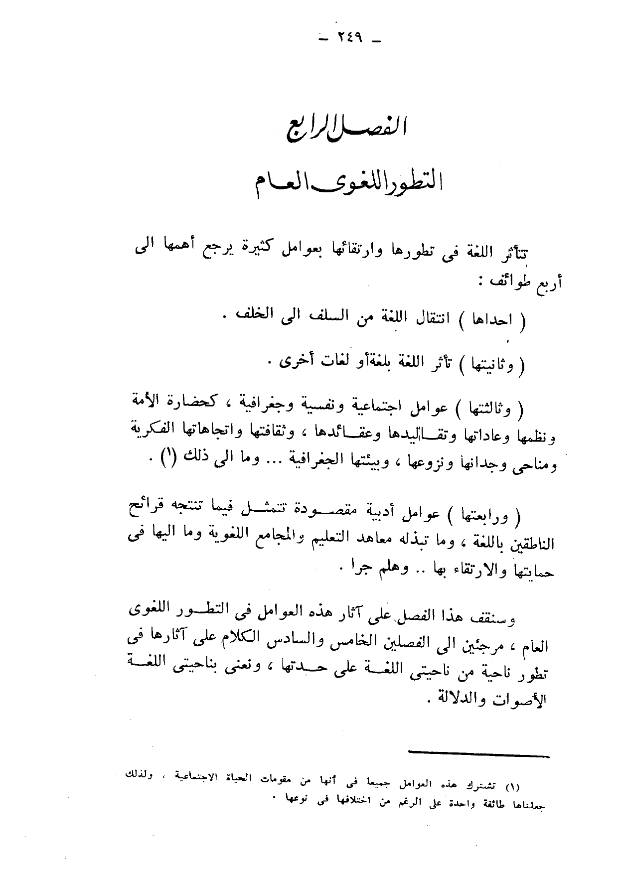 وسنقف هذا الفصل على آثار هذه العوامل في التطور اللغوي العام، مرجئين إلى الفصلين الخامس والسادس الكلام على آثارها في تطور ناحية من ناحيتي اللغة على حدتها، ونعنى بناحيتي اللغة الأصوات والدلالة.