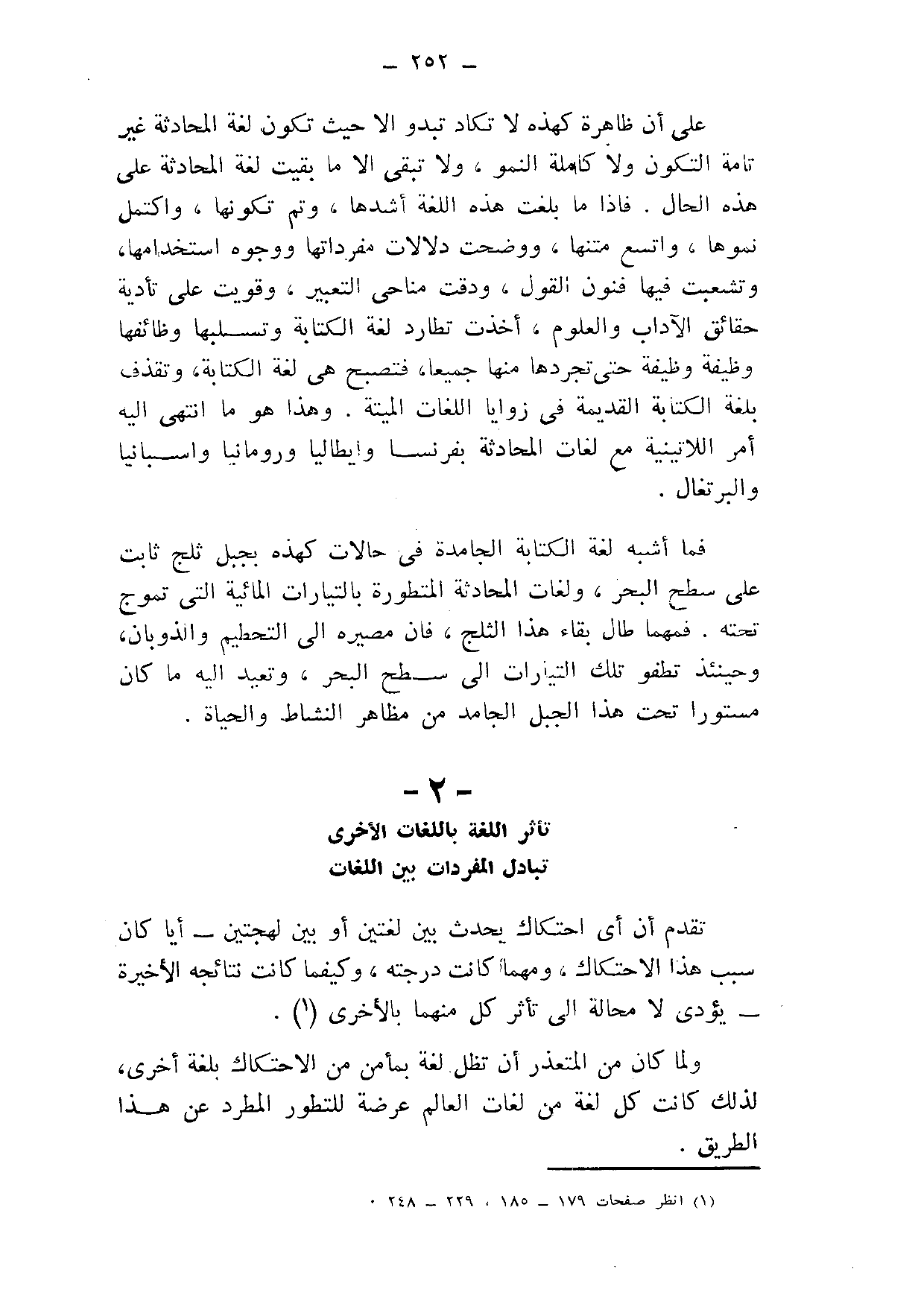 فما أشبه لغة الكتابة الجامدة في حالات كهذه بجبل ثلج ثابت على ما سطح البحر، ولغات المحادثة المتطورة بالتيارات المائية التي تموج تحته, فمهما طال بقاء هذا الثلج، فإن مصيره إلى التحطيم والذوبان، وحينئذ تطفو تلك التيارات إلى سطح البحر، وتعيد إليه ما كان مستورًا تحت هذا الجبل الجامد من مظاهر النشاط والحياة.