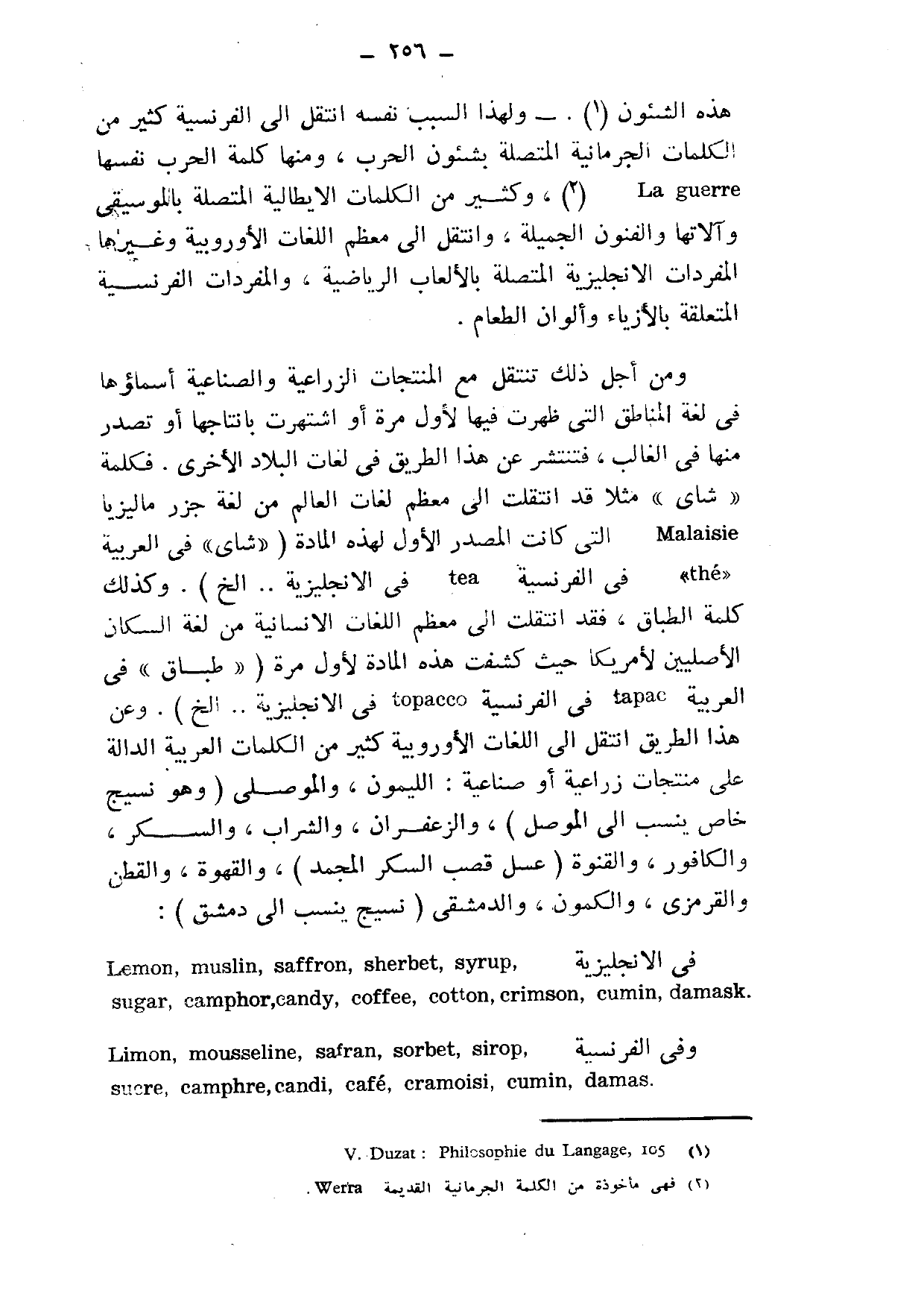 هذه الشئون1. ولهذا السبب نفسه انتقل إلى الفرنسية كثير من الكلمات الجرمانية المتصلة بشئون الحرب، ومنها كلمة الحرب نفسها La guerre2، وكثير من الكلمات الإيطالية المتصلة بالموسيقى وآلاتها والفنون الجميلة، وانتقل إلى معظم اللغات الأوروبية وغيرها المفردات الإنجليزية المتصلة بالألعاب الرياضية، والمفردات الفرنسية المتعلقة بالأزياء وألوان الطعام.