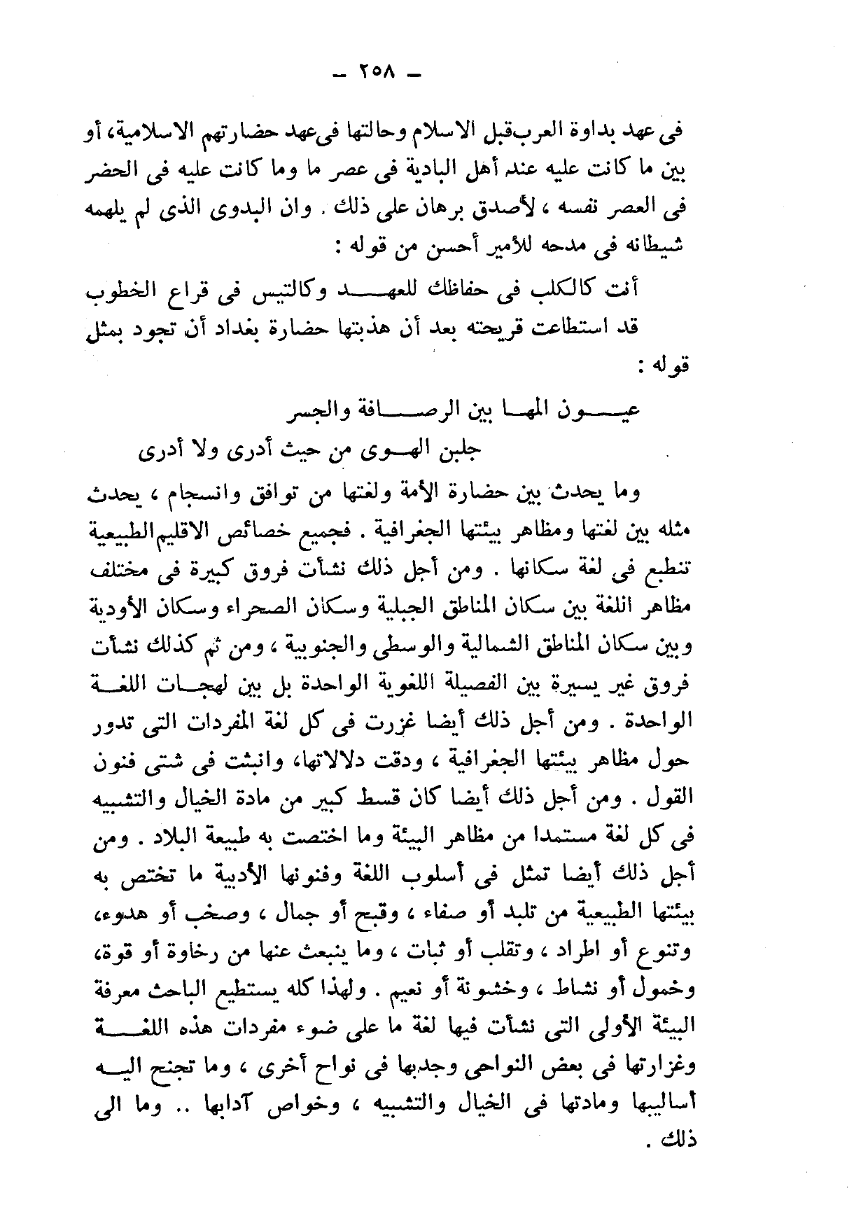 في عهد بداوة العرب قبل الإسلام, وحالتها في عهد حضارتهم الإسلامية، أو بين ما كانت عليه عند أهل البادية في عصر ما, وما كانت عليه في الحضر في العصر نفسه، لأصدق برهان على ذلك, وأن البدويّ الذي لم يلهمه شيطانه في مدحه للأمير أحسن من قوله: