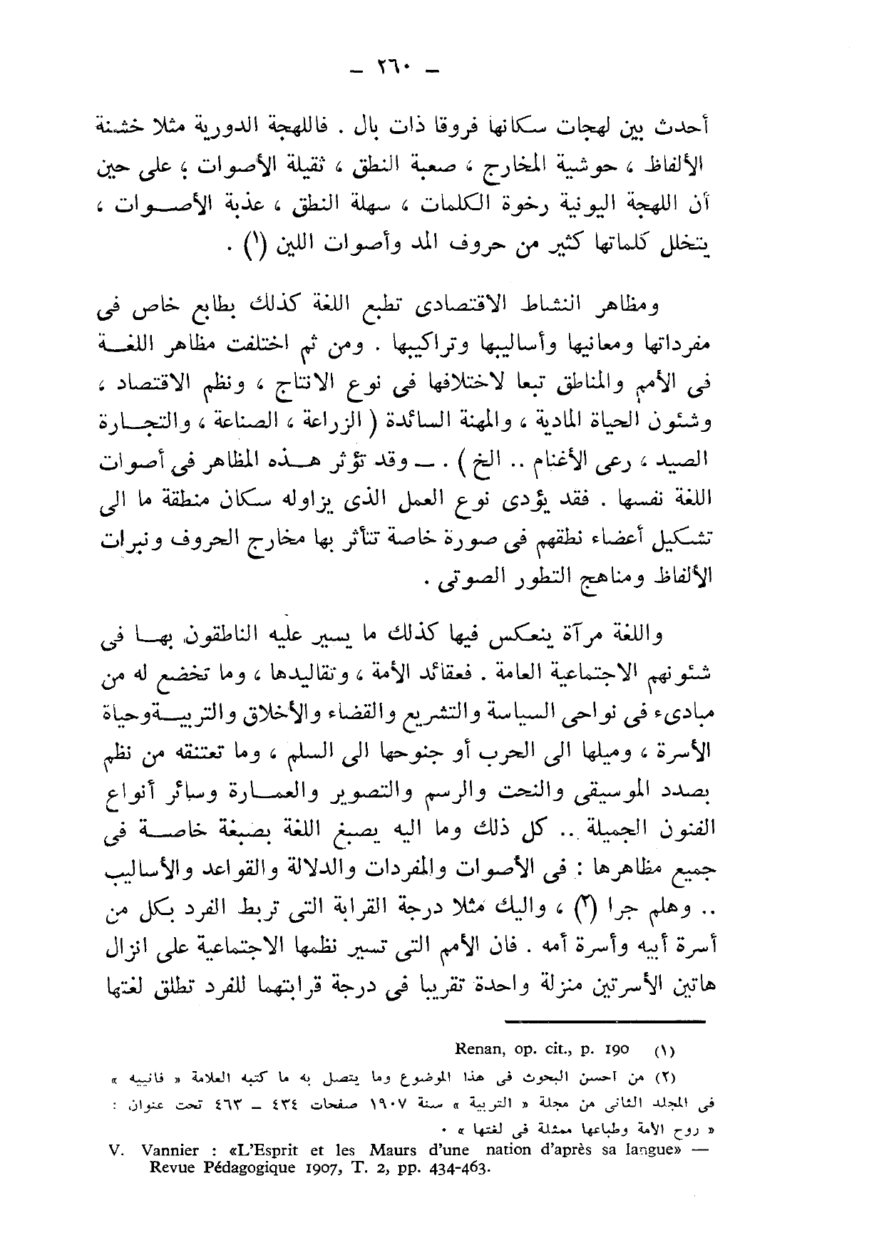 2 من أحسن البحوث في هذا الموضوع وما يتصل به, ما كتبه العلامة "فانييه" في المجلد الثاني من مجلة "التربية" سنة 1907, صفحات 434-463, تحت عنوان: "روح الأمة وطباعها ممثلة في لغتها".