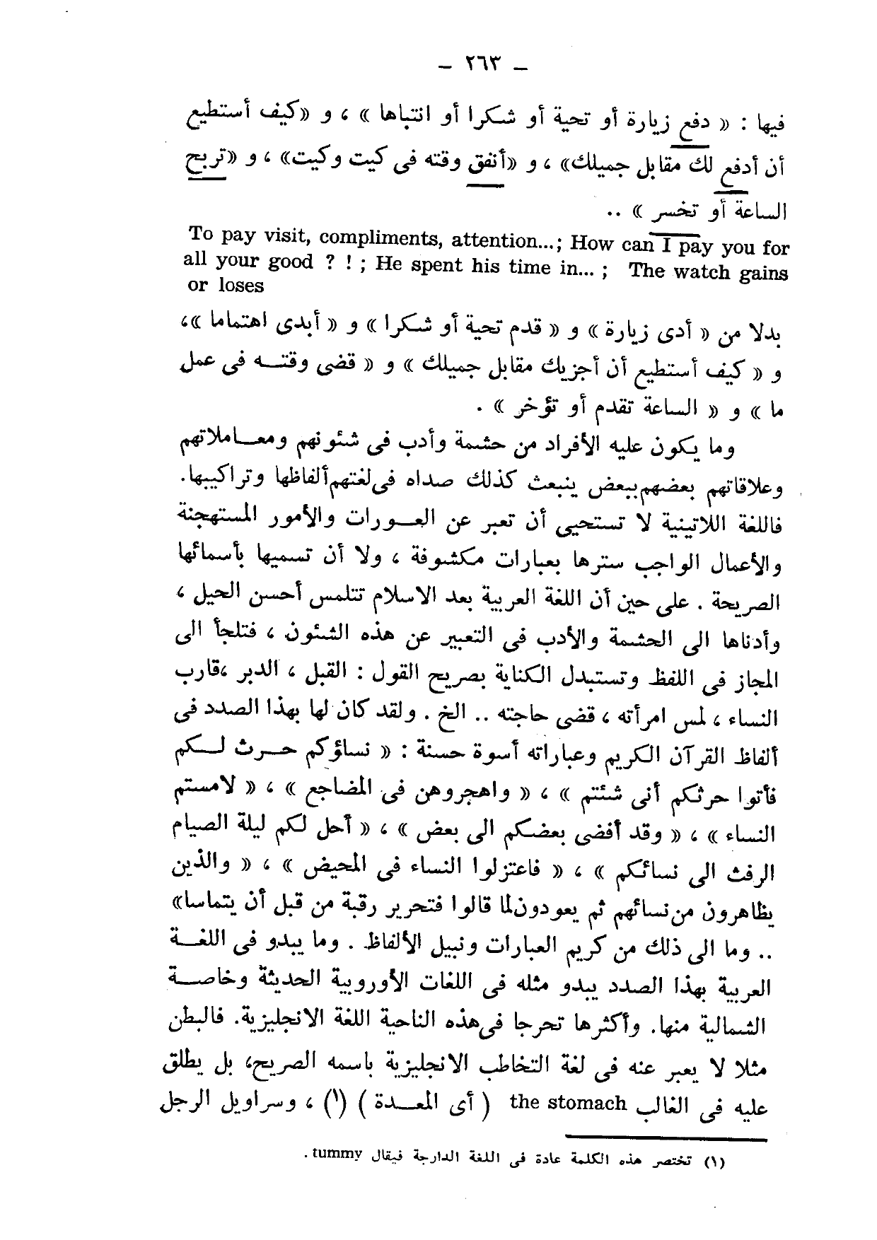 وما يكون عليه الأفراد من حشمة وأدب في شئونهم ومعاملاتهم وعلاقاتهم بعضهم ببعض ينبعث كذلك صداه في لغتهم ألفاظها وتراكيبها. فاللغة اللاتينية لا تستحي أن تعبر عن العورات والأمور المستهجنة, والأعمال الواجب سترها بعبارات مكشوفة، ولا أن تسميها بأسمائها الصريحة. على حين أن اللغة العربية بعد الإسلام تتلمس أحسن الحيل، وأدناها إلى الحشمة والأدب في التعبير عن هذه الشئون، فتلجأ إلى المجاز في اللفظ, وتستبدل الكناية بصريح القول: القبل، الدبر، قارب النساء، لمس امرأته، قضى حاجته..إلخ. ولقد كان لها بهذا الصدد في ألفاظ القرن الكريم وعباراته أسوة حسنة: {نِسَاؤُكُمْ حَرْثٌ لَكُمْ فَأْتُوا حَرْثَكُمْ أَنَّى شِئْتُمْ} ، {وَاهْجُرُوهُنَّ فِي الْمَضَاجِع} ، {لامَسْتُمُ النِّسَاءَ} ، {وَقَدْ أَفْضَى بَعْضُكُمْ إِلَى بَعْض} ، {أُحِلَّ لَكُمْ لَيْلَةَ الصِّيَامِ الرَّفَثُ إِلَى نِسَائِكُمْ} ، {فَاعْتَزِلُوا النِّسَاءَ فِي الْمَحِيضِ} ، {وَالَّذِينَ يُظَاهِرُونَ مِنْ نِسَائِهِمْ ثُمَّ يَعُودُونَ لِمَا قَالُوا فَتَحْرِيرُ رَقَبَةٍ مِنْ قَبْلِ أَنْ يَتَمَاسَّا} .. وما إلى ذلك من كريم العبارات ونبيل الألفاظ, وما يبدو في اللغة العربية بهذا الصدد يبدو مثله في اللغات الأوربية الحديثة, وخاصة الشمالية منها. وأكثرها تحرجًا في هذه الناحية اللغة الإنجليزية؛ فالبطن مثلًا لا يعبر عنه في لغة التخاطب الإنجليزية باسمه الصريح، بل يطلق عليه في الغالب the stomach "أي المعدة"1، وسراويل الرجل