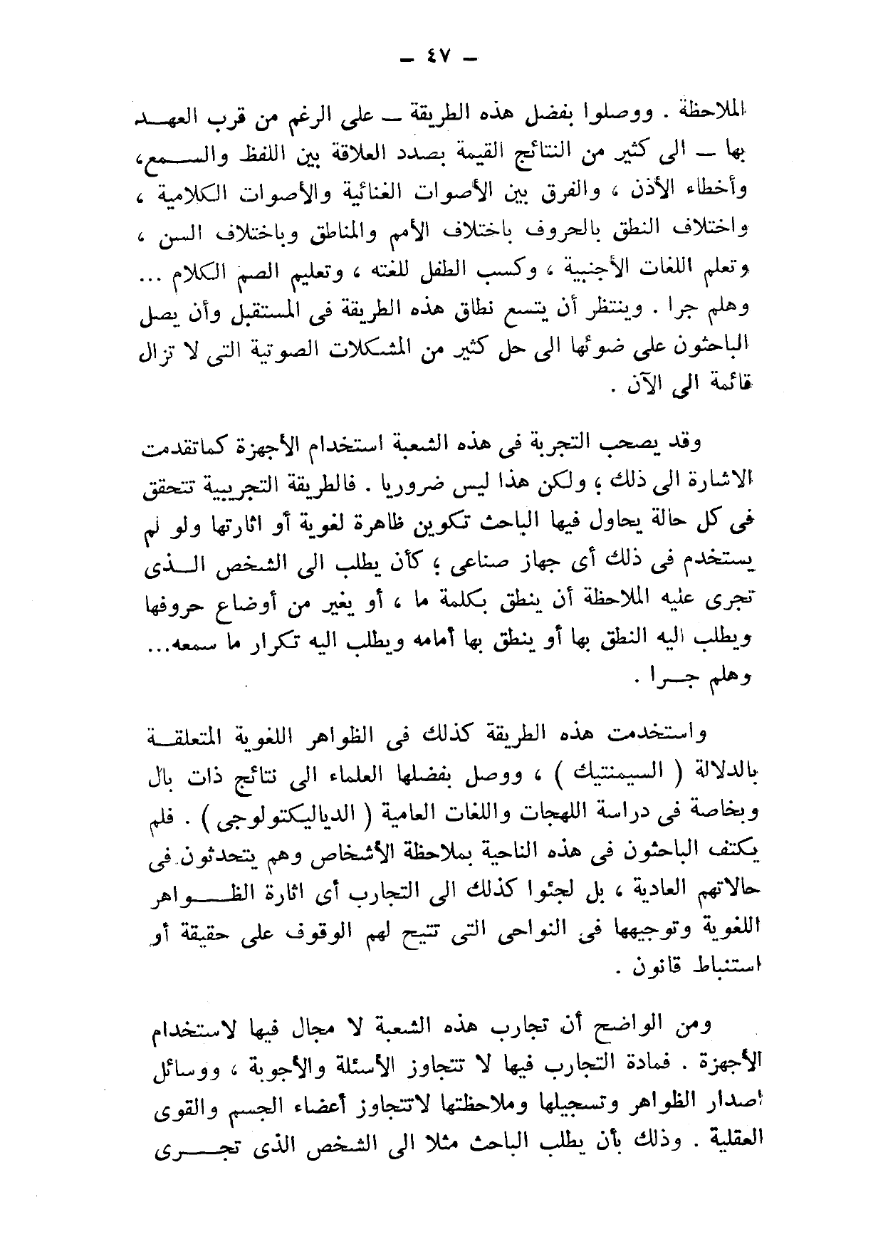الملاحظة, ووصلوا بفضل هذه الطريقة -على الرغم من قرب العهد بها- إلى كثير من النتائج بصدد العلاقة بين اللفظ والسمع، وأخطاء الأذن، والفرق بين الأصوات الغنائية والأصوات الكلامية، واختلاف النطق بالحروف باختلاف الأمم والمناطق وباختلاف السن، وتعلم اللغات الأجنبية، وكسب الطفل للغته، وتعليم الصم الكلام ... وهلمّ جرَّا. وينتظر أن يتسع نطاق هذه الطريقة في المستقبل, وأن يصل الباحثون على ضوئها إلى حلّ كثيرٍ من المشكلات الصوتية التي لا تزال قائمة إلى الآن.