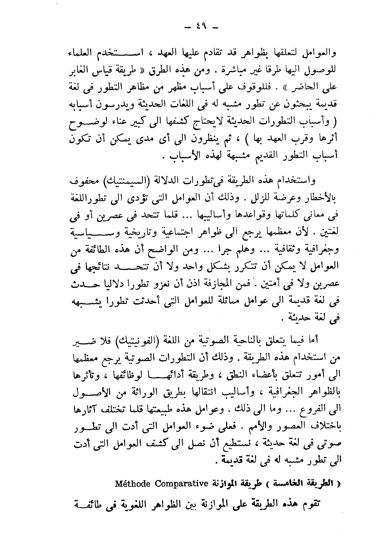 واستخدام هذه الطريقة في تطورات الدلالة "السيمنتيك" محفوف بالأخطار وعرضة للزلل, وذلك أن العوامل التي تؤدي إلى تطور اللغة في معاني كلماتها وقواعدها وأساليبها.. قلما تتحد في عصرين أو في لغتين؛ لأن معظمها يرجع إلى ظواهر اجتماعية وتاريخية وسياسية وجغرافية وثقافية.. وهلم جرا.. ومن الواضح أن هذه الطائفة من العوالم لا يمكن أن تتكرر بشكل واحد, ولا أن تتحد نتائجها في عصرين ولا في أمتين, فمن المجازفة إذن أن نعزو تطورًا دلاليًّا حدث في لغة قديمةٍ إلى عوامل مماثلة للعوامل التي أحدثت تطورًا يشبهه في لغة حديثة.