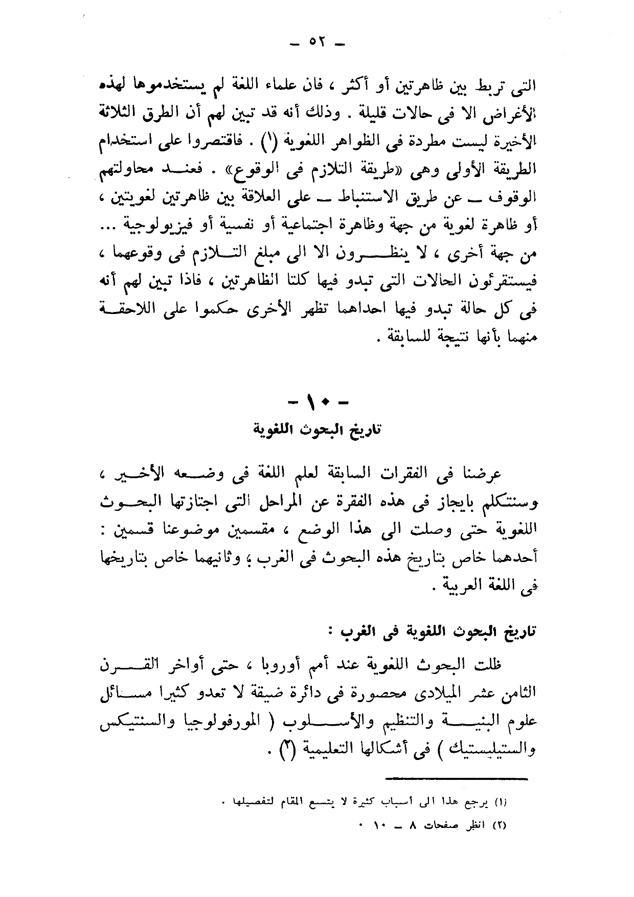 عرضنا في الفقرات السابقة لعلم اللغة في وضعه الأخير، وسنتكلم بإيجاز في هذه الفقرة عن المراحل التي اجتازتها البحوث اللغوية حتى وصلت إلى هذا الوضع، مقسمين موضوعنا قسمين: أحدهما: خاص بتاريخ هذه البحوث في الغرب، وثانيهما: خاصٌّ بتاريخها في اللغة العربية.