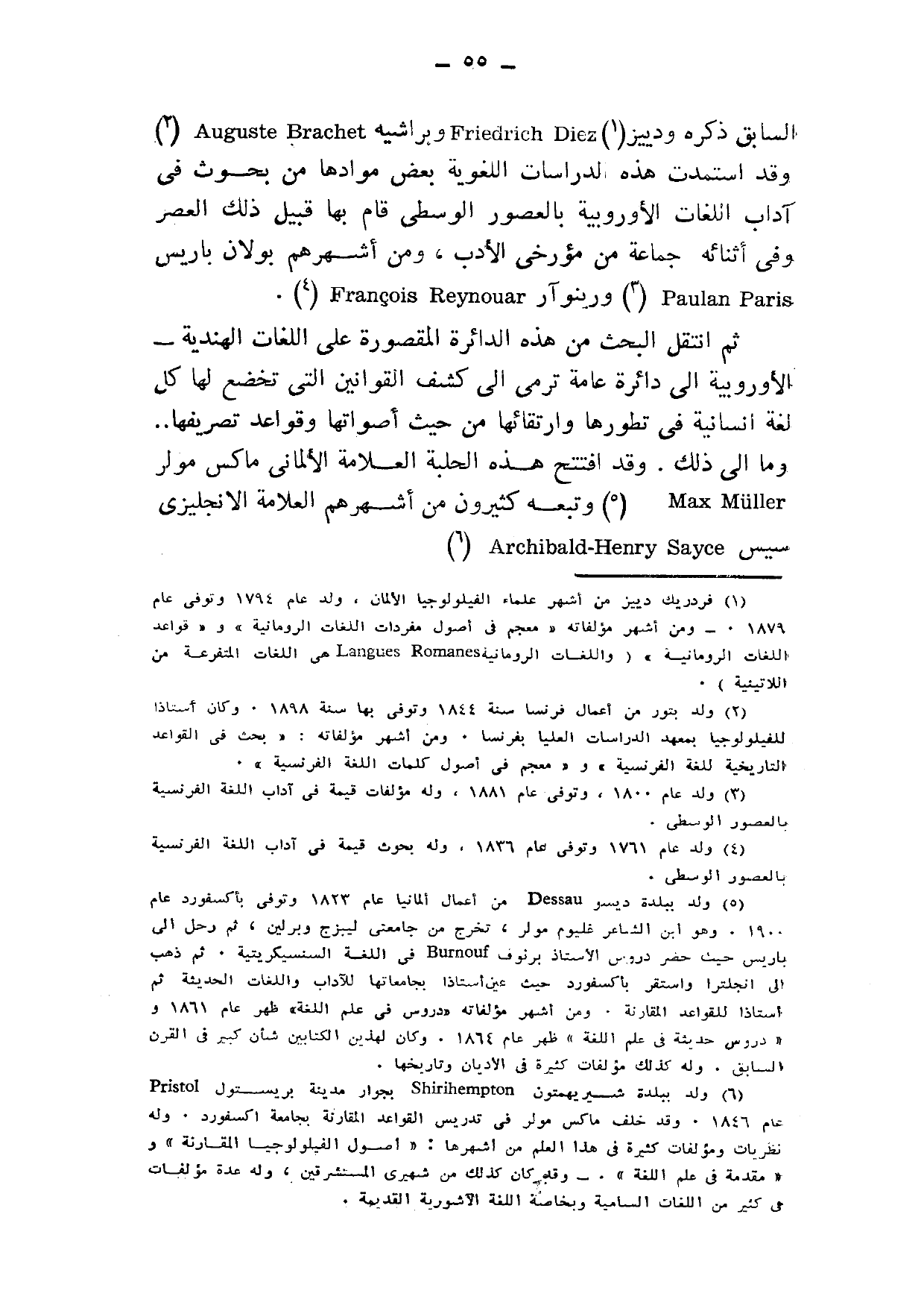 السابق ذكره, ودييز1 Friedrich, وبراشيه2 Auguste Brachet, وقد استمدت هذه الدراسات اللغوية بعض موادها من بحوث في آداب اللغات الأوربية بالعصور الوسطى, قام بها قبيل ذلك العصر وفي أثنائه جماعة من مؤرخي الأدب، ومن أشهرهم: بولان باريس3 Paulan Paris, وربنو آر4 Francois Reynouar.