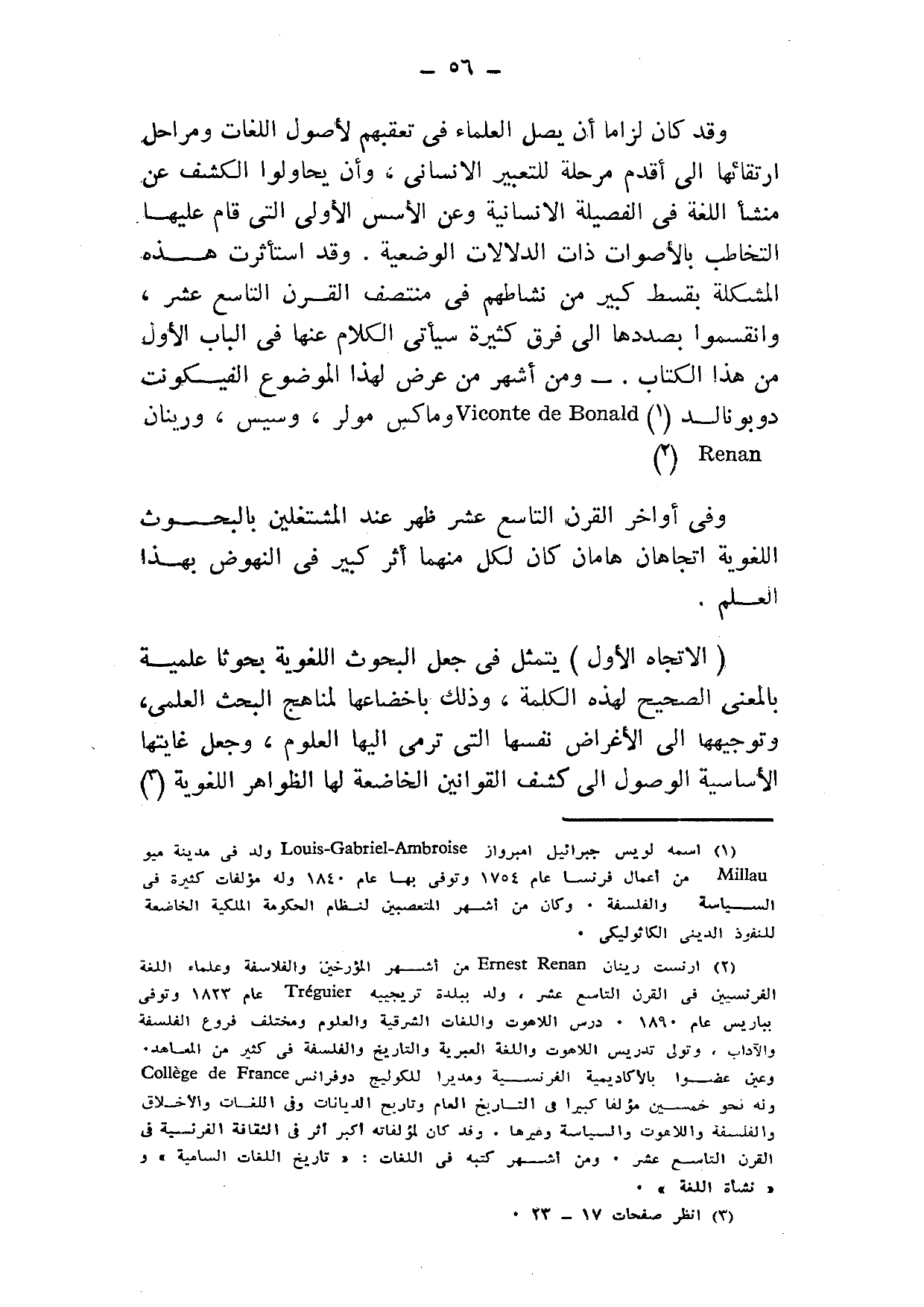 وقد كان لزامًا أن يصل العلماء في تعقبهم لأصول اللغات ومراحل ارتقائها إلى أقدم مرحلة للتعبير الإنساني، وأن يحاولوا الكشف عن منشأ اللغة في الفصيلة الإنسانية, وعن الأسس الأولى التي قام عليها التخاطب بالأصوات ذات الدلالات الوضعية, وقد استأثرت هذه المشكلة بقسط كبير من نشاطهم في منتصف القرن التاسع عشر، وانقسموا بصددها إلى فرق كثيرة -سيأتي الكلام عنها في الباب الأول من هذا الكتاب, ومن أشهر من عرض لهذا الموضوع: الفيكونت دوبونالد1 Viconte de Bonald وماكس مولر، وسيس، ورينان2 Renan.