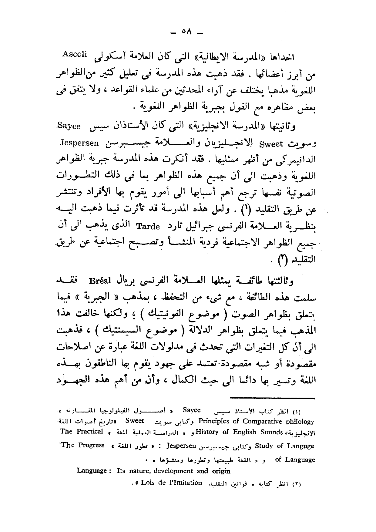 1 انظر كتاب الأستاد سيس Sayce "أصول الفيلولوجيا المقارنة" Principles of Comparative philology, وكتابي سويت Sweet "تاريخ أصوات اللغة الإنجليزية History of English Sounds و"الدراسة العملية للغة" The Practical Study of Languge, وكتابي جيسبرسن Jespersen: "تطور اللغة" The Progress of Language و"الغة طبيعتها وتطورها ومنشئوها".