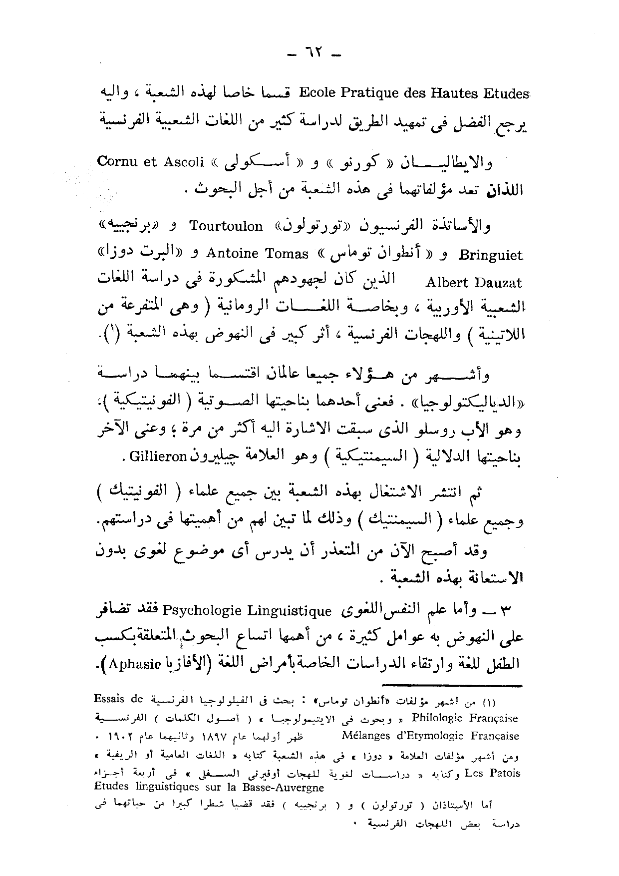 والأساتذة الفرنسيون: "تورتولون" Tourtoulon, و"برنجييه" Bringuiet, و"أنطوان توماس" Antoine Tomas, و"ألبرت دوزا" Albert Dauzat, الذين كان لجهودهم المشكورة في دراسة اللغات الشعبية الأوربية، وبخاصة اللغات الرومانية -وهي المتفرقة من اللاتينية- واللهجات الفرنسية، أثر كبير في النهوض بهذه الشعبة1.