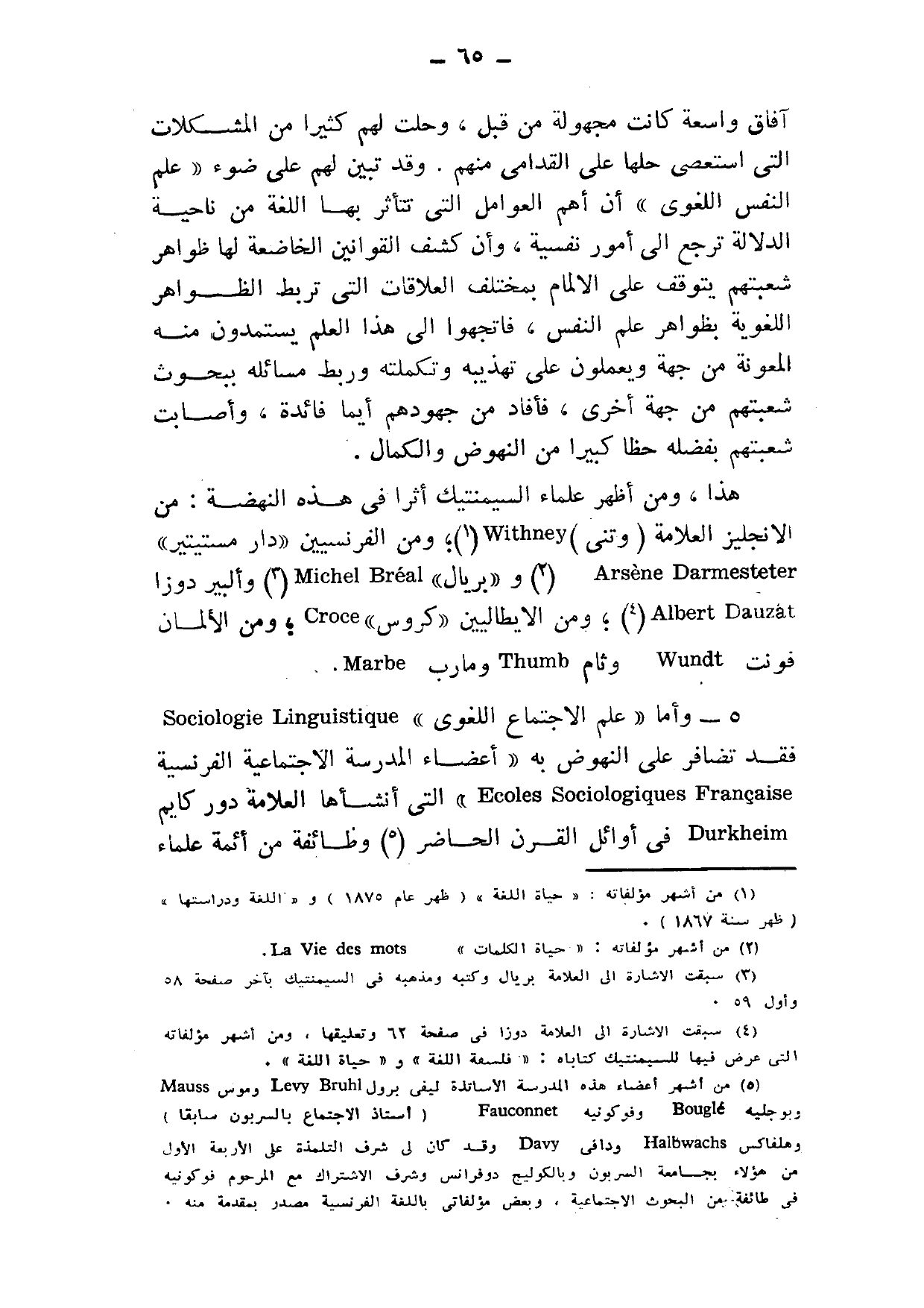5- وأما "علم الاجتماع اللغوي" Sociologie Linguistique, فقد تضافر على النهوض به "أعضاء المدرسة الاجتماعية الفرنسية Ecoles Sociologiques Francaise, التي أنشأها العلامة دوركايم Durkheim, في أوائل القرن الحاضر5, وطائفة من أئمة علماء