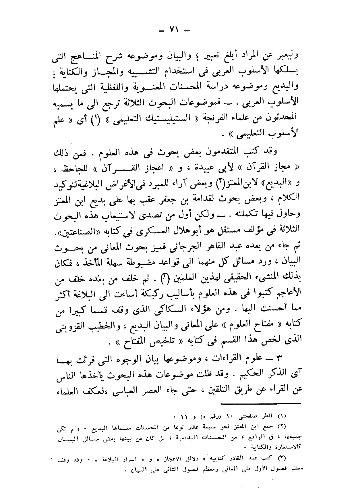 وليعبر عن المراد أبلغ، والبيان, وموضوعه: شرح المناهج التي يسلكها الأسلوب العربي في استخدام التشبيه والمجاز والكناية، والبديع, وموضوعه: دراسة المحسنات المعنوية واللفظية التي يحتملها الأسلوب العربي؛ فموضوعات البحوث الثلاثة ترجع إلى ما يسميه المحدثون من علماء الفرنجة "الستيليستيك التعليمي"1 أي "علم الأسلوب التعليمي".
