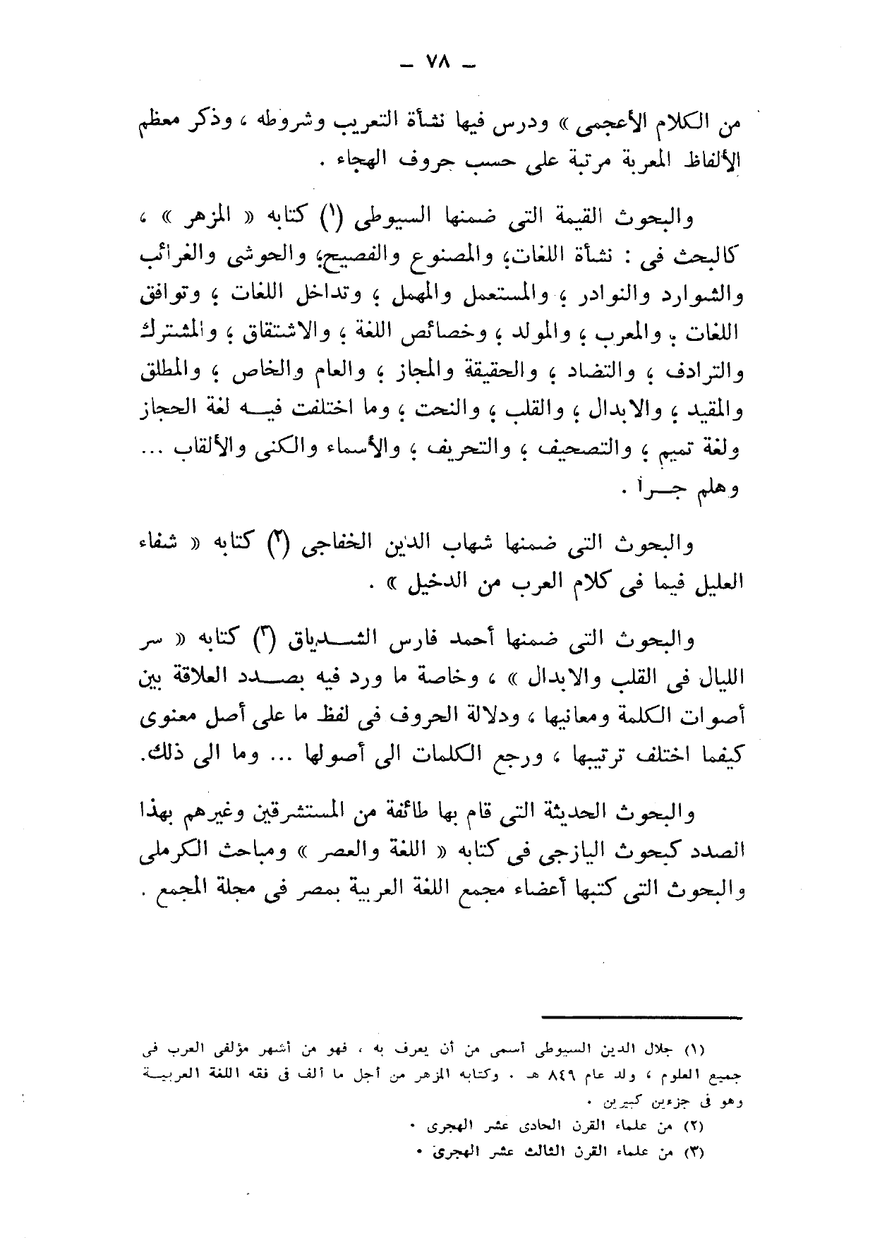 1 جلال الدين السيوطي أسمى من أن يعرف به، فهو من أشهر مؤلفي العرب في جميع العلوم، ولد عام 849هـ, وكتابه المزهر من أجَلِّ ما ألف في فقه اللغة العربية, وهو في جزءين كبيرين.
