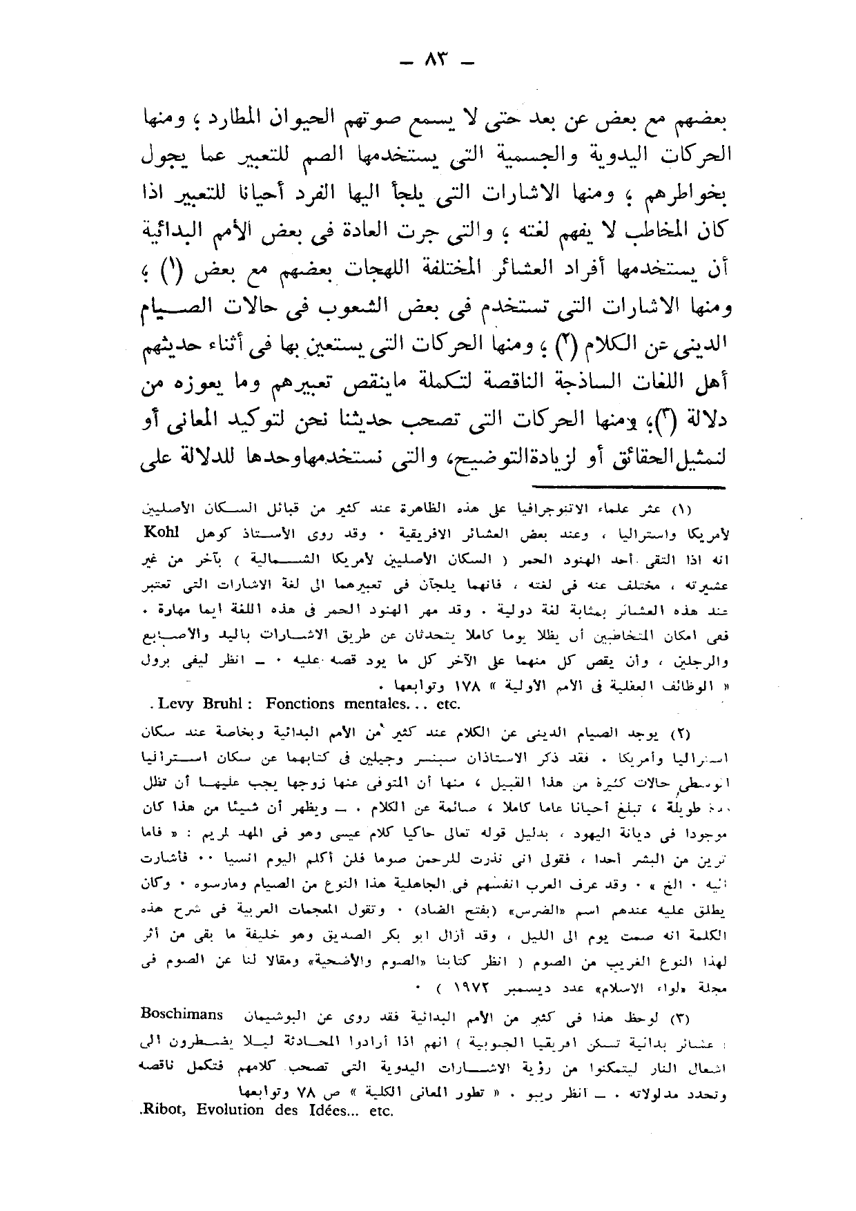 3 لوحظ هذا في كثير من الأمم البدائية؛ فقد رُوِيَ عن البوشيمان Boschimans عشائر بدائية تسكن أفريقيا الجنوبية" إنه إذا أرادوا المحادثة ليلًا يضطرون إلى إشعال النار ليتمكنوا من رؤية الإشارات اليدوية التي تصحب كلامهم فتكمل ناقصه وتحدد مدلولاته. انظر ريبو "تطور المعاني الكلية" ص78, وتوابعها.