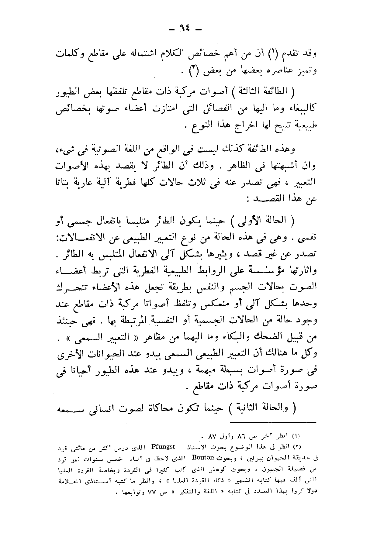 2 انظر في هذا الموضوع بحوث الأستاذ Pfungst الذي درس أكثر من مائتي قرد في حديقة الحيوان ببرلين، وبحوث Bouton الذي لاحظ في أثناء خمس سنوات نمو قرد من فصيلة الجيبون، وبحوث كوهلر الذي كتب كثيرًا في القردة, وبخاصة القردة العليا, التي ألف فيها كتابه الشهير "ذكاء القردة العليا", وانظر ما كتبه أستاذي العلامة دولا كروا بهذا الصدد في كتابه "اللغة والتفكير" ص77 وتوابعها.