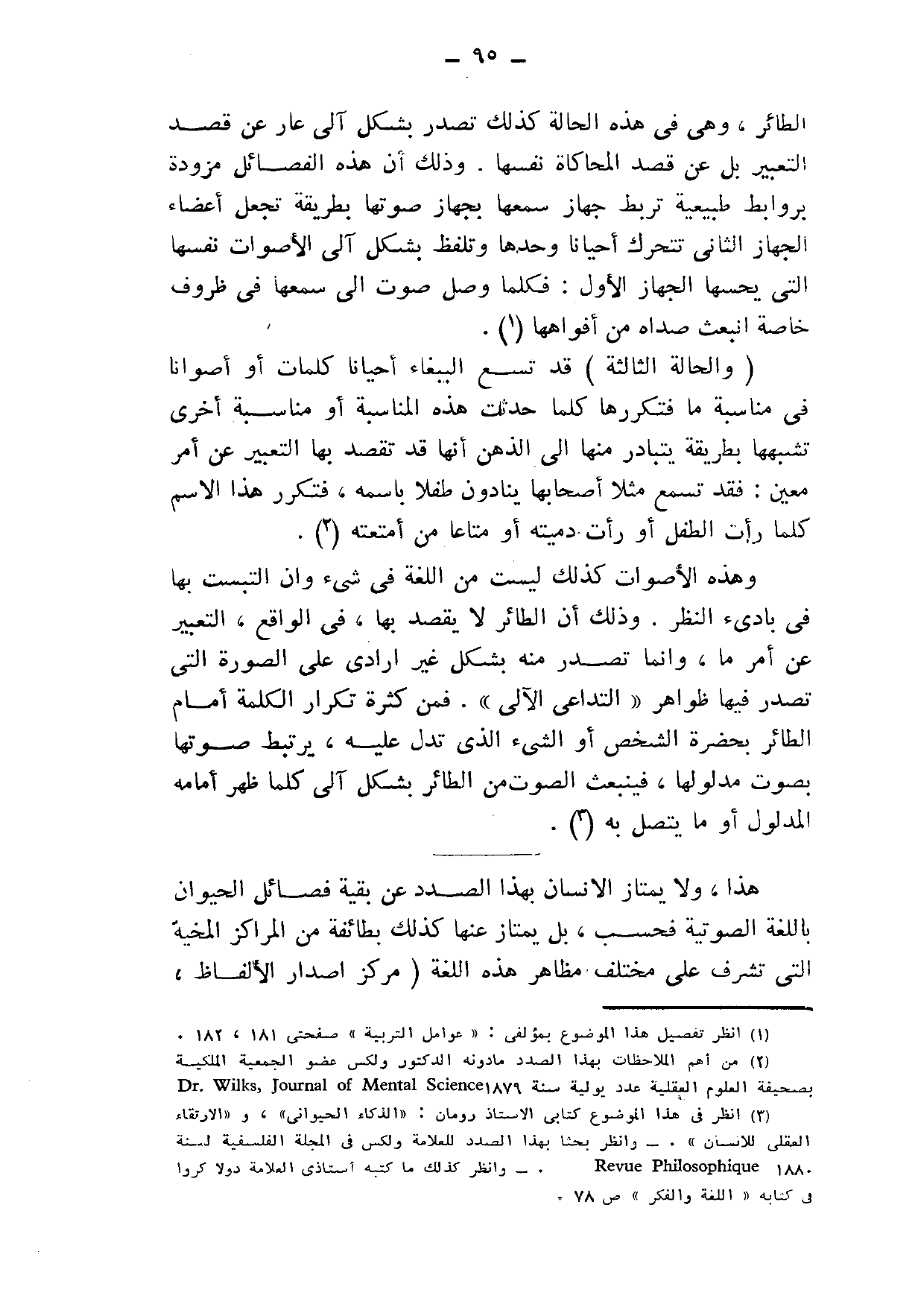 3 انظر في هذا الموضوع كتابي الأستاذ رومان: "الذكاء الحيواني"، و"الارتقاء العقلي للإنسان". وانظر بحثًا بهذا الصدد للعلامة ولكس في المجلة الفلسفية لسنة 1880 Reve Philosphique. وانظر كذلك ما كتبه أستاذي العلامة دولا كروا في كتابه "اللغة والفكر" ص78.