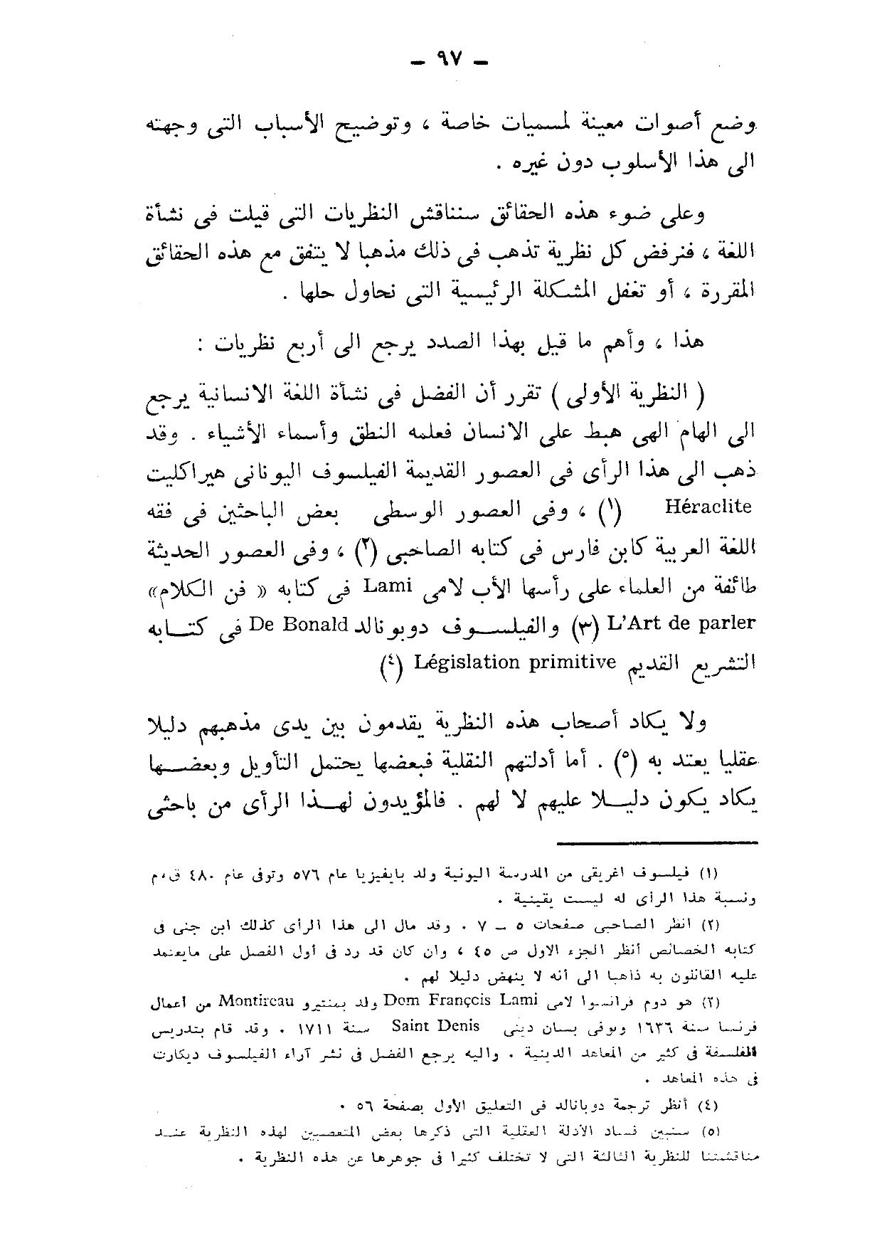 وعلى ضوء هذه الحقائق سنناقش النظريات التي قيلت في نشأة اللغة، فنرفض كل نظرية تذهب في ذلك مذهبًا لا يتفق مع هذه الحقائق المقررة، أو تغفل المشكلة الرئيسية التي نحاول حلها.