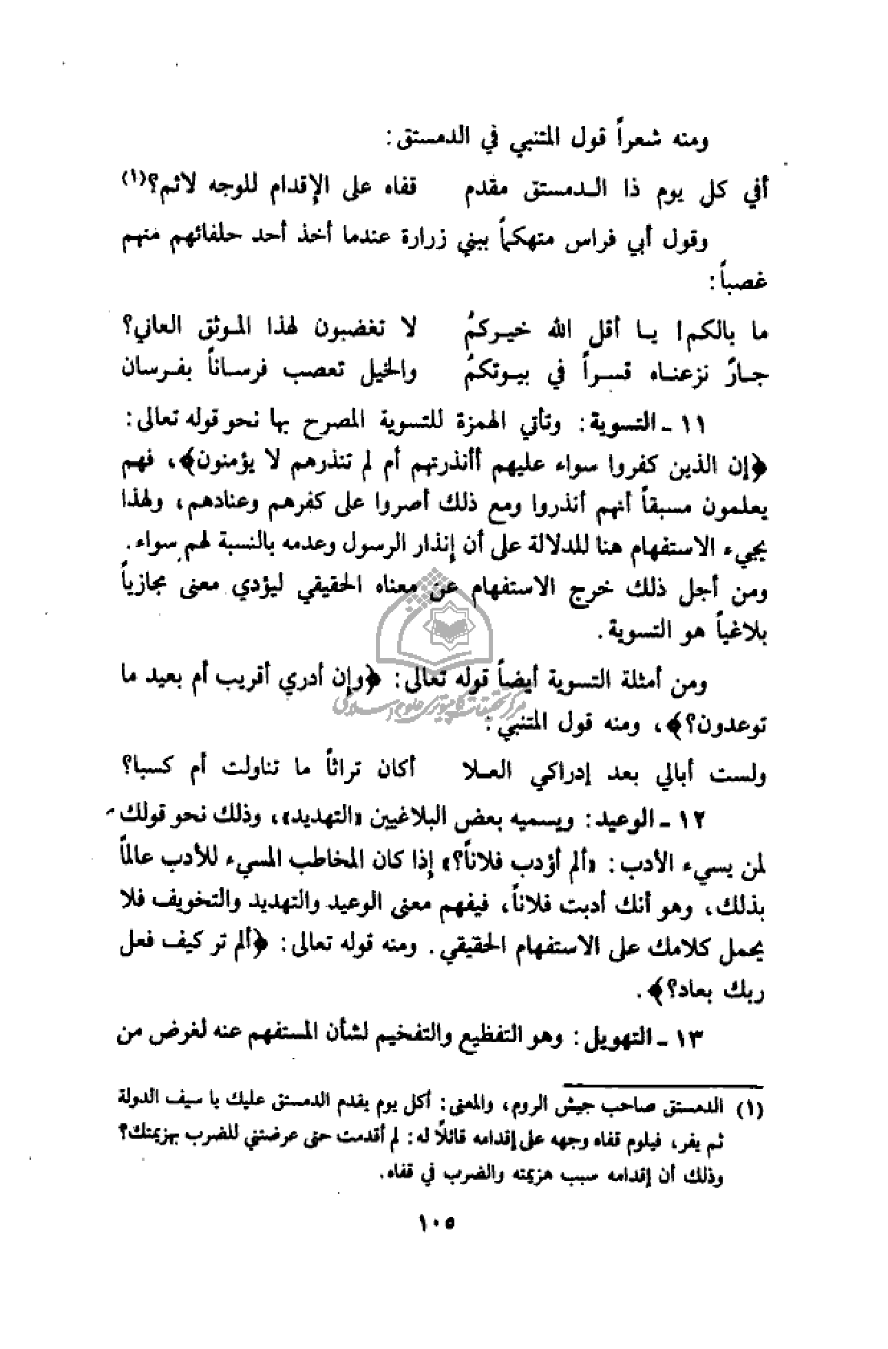 (¬1) الدمستق صاحب جيش الروم، والمعنى: أكل يوم يقدم الدمستق عليك يا سيف الدولة ثم يفر، فيلوم قفاه وجهه على إقدامه قائلا له: لم أقدمت حتى عرضتني للضرب بهزيمتك؟
