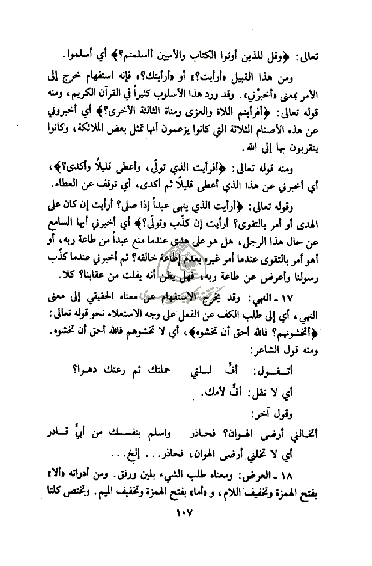 ومن هذا القبيل «أرأيت؟» أو «أرأيتك؟» فإنه استفهام خرج إلى الأمر بمعنى «أخبرني». وقد ورد هذا الأسلوب كثيرا في القرآن الكريم، ومنه قوله تعالى: أَفَرَأَيْتُمُ اللَّاتَ وَالْعُزَّى وَمَناةَ الثَّالِثَةَ الْأُخْرى؟ أي أخبروني عن هذه الأصنام الثلاثة التي كانوا يزعمون أنها تمثل بعض الملائكة، وكانوا يتقربون بها إلى الله.