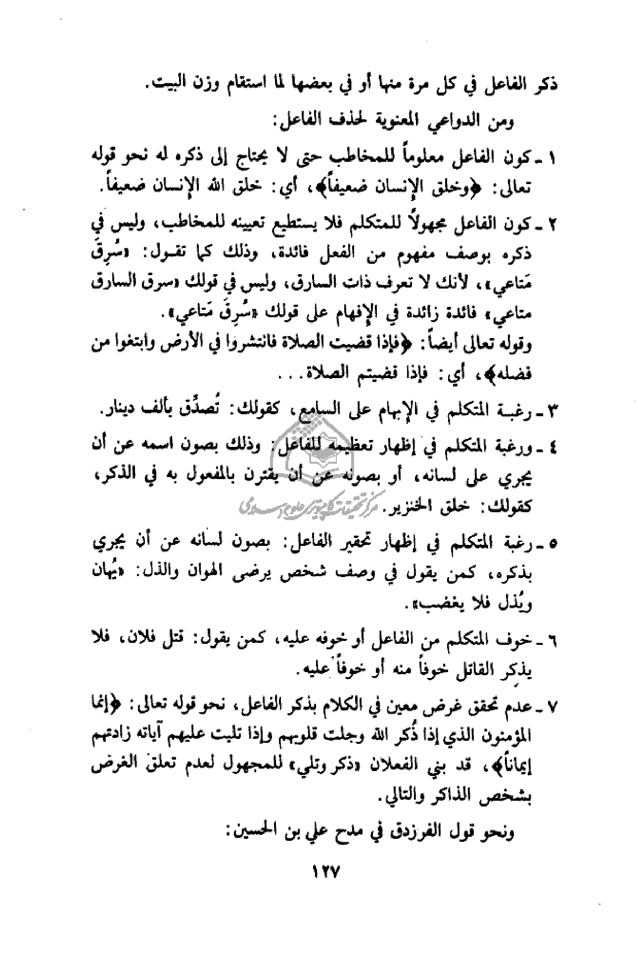 7 - عدم تحقق غرض معين في الكلام بذكر الفاعل، نحو قوله تعالى: إِنَّمَا الْمُؤْمِنُونَ الذي إِذا ذُكِرَ اللَّهُ وَجِلَتْ قُلُوبُهُمْ