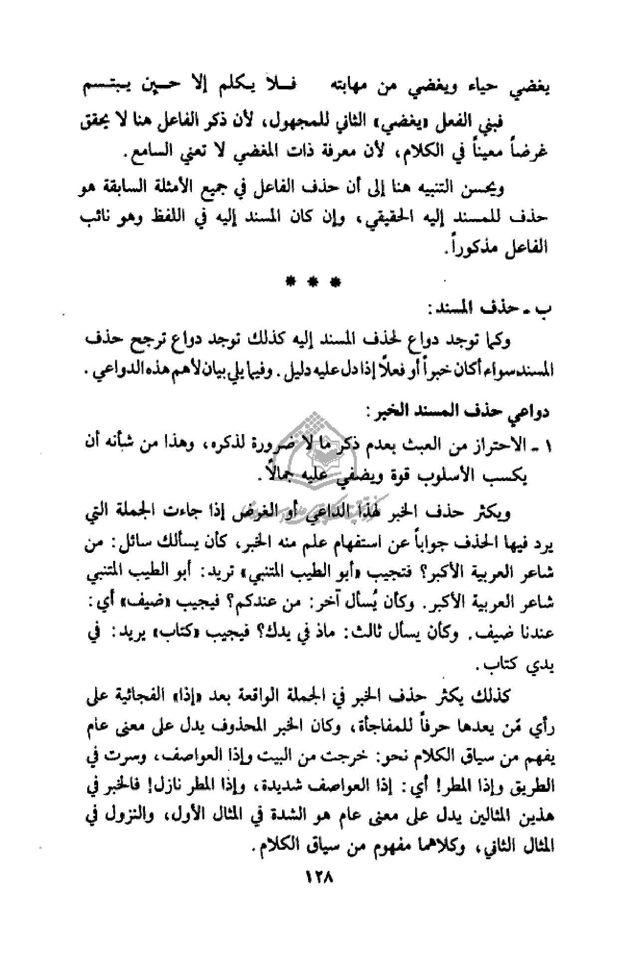 كذلك يكثر حذف الخبر في الجملة الواقعة بعد «إذا» الفجائية على رأي من يعدها حرفا للمفاجأة، وكان الخبر المحذوف يدل على معنى عام يفهم من سياق الكلام نحو: خرجت من البيت وإذا العواصف، وسرت في الطريق وإذا المطر! أي: إذا العواصف شديدة، وإذا المطر نازل! فالخبر في هذين المثالين يدل على معنى عام هو الشدة في المثال الأول، والنزول في المثال الثاني، وكلاهما مفهوم من سياق الكلام.