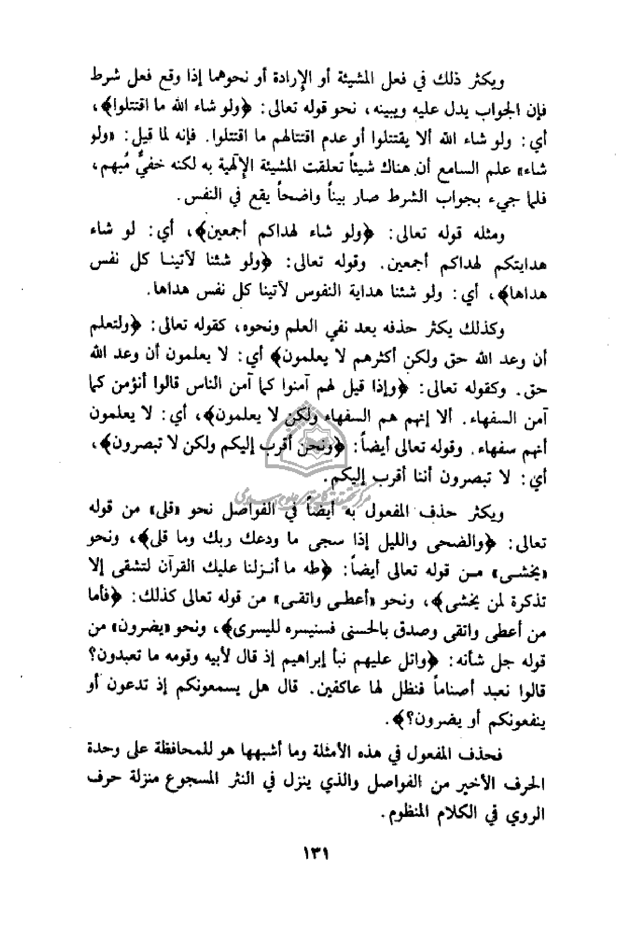 ويكثر حذف المفعول به أيضا في الفواصل نحو «قلى» من قوله تعالى: وَالضُّحى وَاللَّيْلِ إِذا سَجى ما وَدَّعَكَ رَبُّكَ وَما قَلى، ونحو «يخشى» من قوله تعالى أيضا: طه ما أَنْزَلْنا عَلَيْكَ الْقُرْآنَ لِتَشْقى إِلَّا تَذْكِرَةً لِمَنْ يَخْشى، ونحو «أعطى واتقى» من قوله تعالى كذلك: فَأَمَّا مَنْ أَعْطى وَاتَّقى وَصَدَّقَ بِالْحُسْنى فَسَنُيَسِّرُهُ لِلْيُسْرى، ونحو «يضرون» من قوله جل شأنه: وَاتْلُ عَلَيْهِمْ نَبَأَ إِبْراهِيمَ إِذْ قالَ لِأَبِيهِ وَقَوْمِهِ ما تَعْبُدُونَ؟ قالُوا نَعْبُدُ أَصْناماً فَنَظَلُّ لَها عاكِفِينَ. قالَ هَلْ يَسْمَعُونَكُمْ إِذْ تَدْعُونَ أَوْ يَنْفَعُونَكُمْ أَوْ يَضُرُّونَ؟.