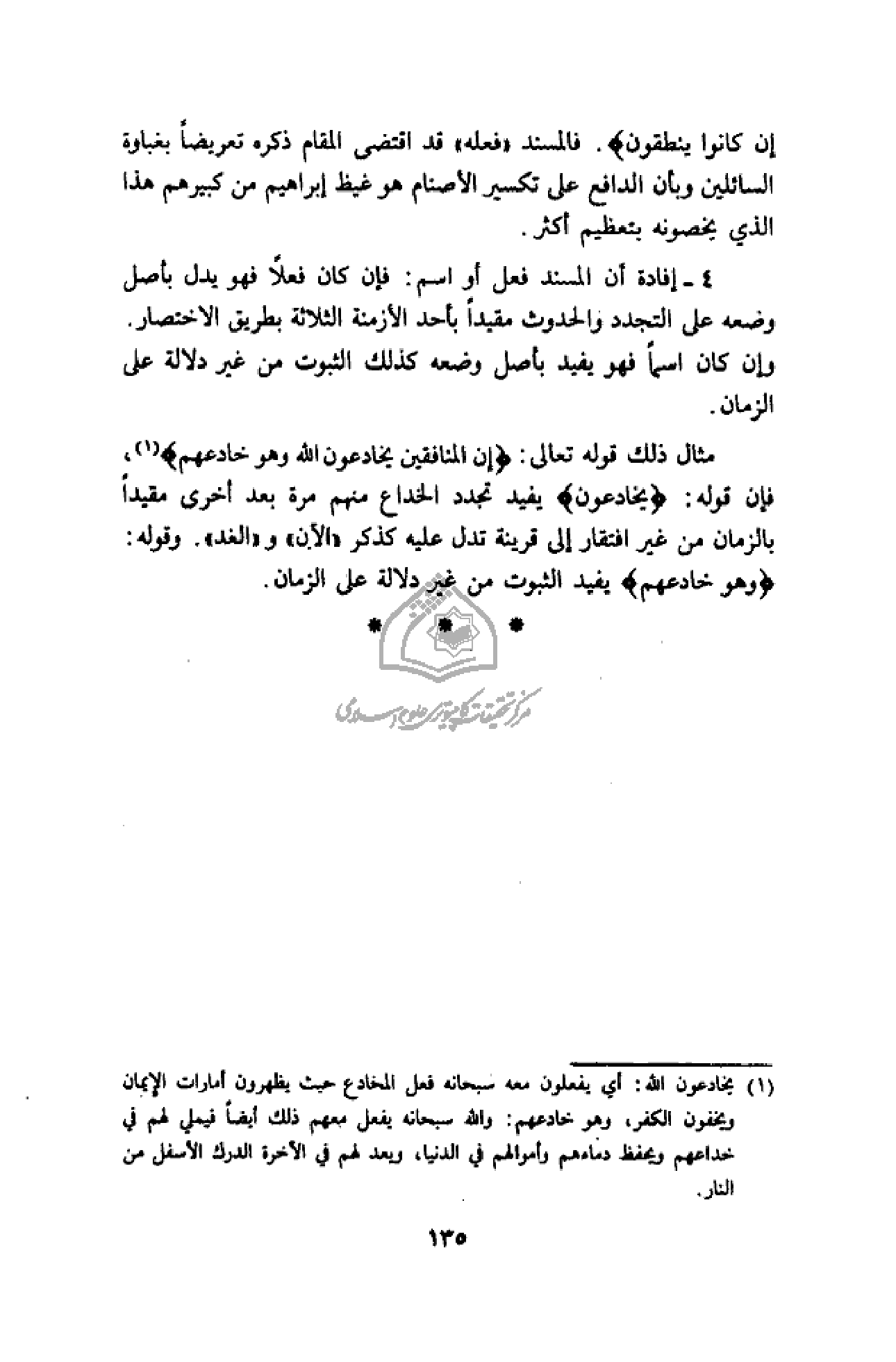 مثال ذلك قوله تعالى: إِنَّ الْمُنافِقِينَ يُخادِعُونَ اللَّهَ وَهُوَ خادِعُهُمْ (¬1)، فإن قوله: يُخادِعُونَ يفيد تجدد الخداع منهم مرة بعد أخرى مقيدا بالزمان من غير افتقار إلى قرينة تدل عليه كذكر «الآن» و «الغد». وقوله: