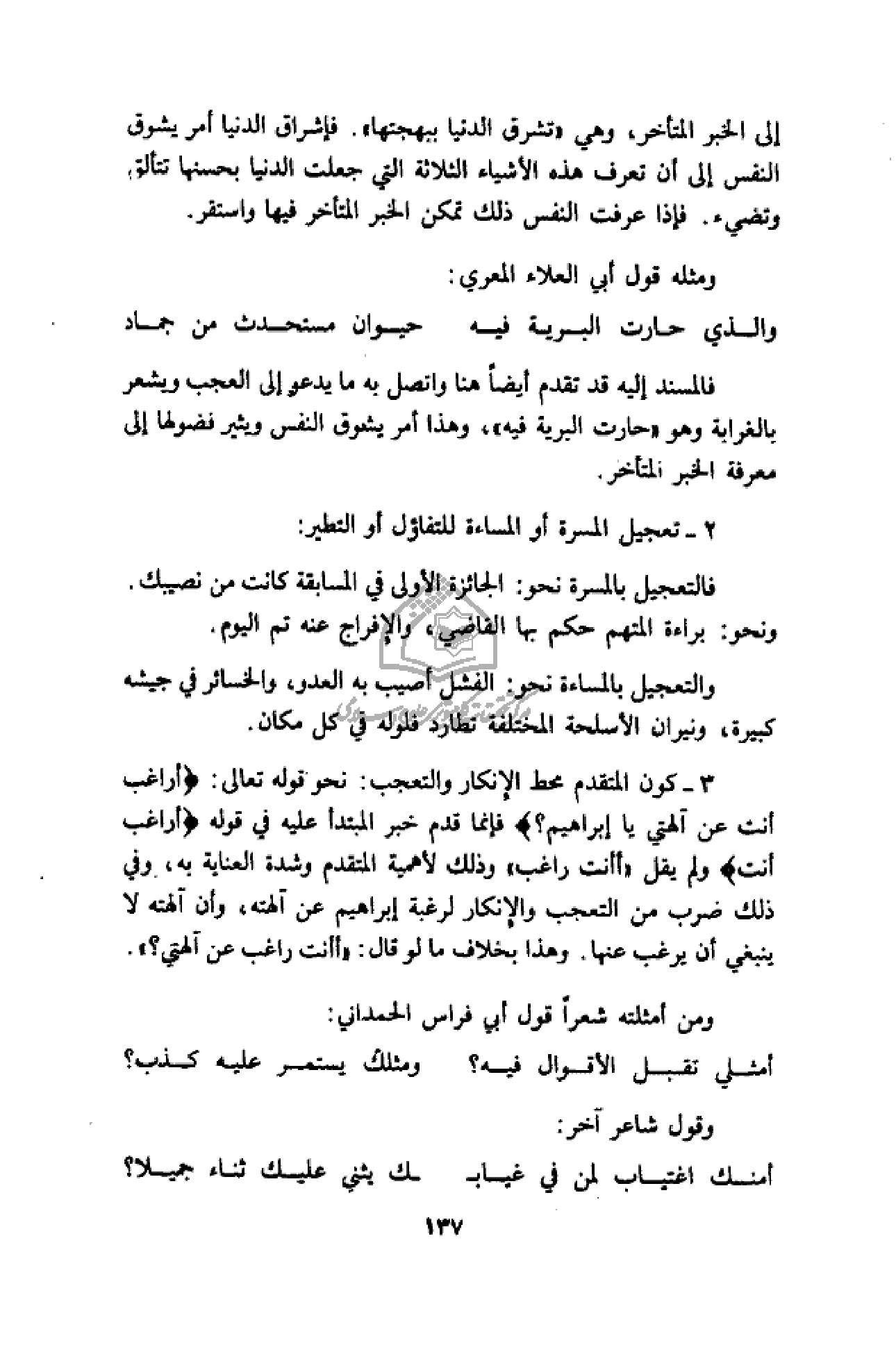 فالمسند إليه قد تقدم أيضا هنا واتصل به ما يدعو إلى العجب ويشعر بالغرابة وهو «حارت البرية فيه»، وهذا أمر يشوق النفس ويثير فضولها إلى معرفة الخبر المتأخر.