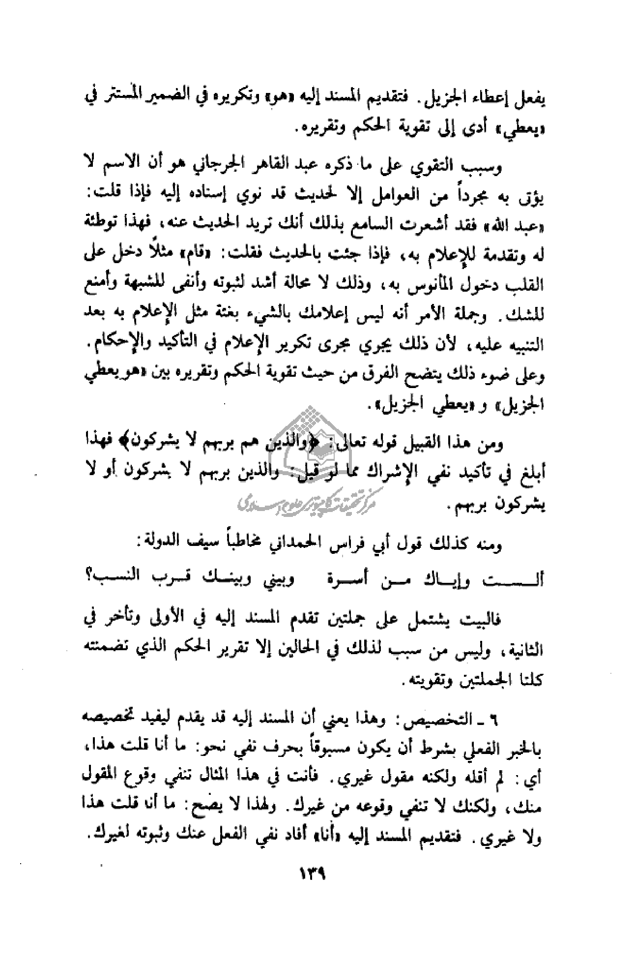 6 - التخصيص: وهذا يعني أن المسند إليه قد يقدم ليفيد تخصيصه بالخبر الفعلي بشرط أن يكون مسبوقا بحرف نفي نحو: ما أنا قلت هذا، أي: لم أقله ولكنه مقول غيري. فأنت في هذا المثال تنفي وقوع المقول منك، ولكنك لا تنفي وقوعه من غيرك. ولهذا لا يصح: ما أنا قلت هذا ولا غيري. فتقديم المسند إليه «أنا» أفاد نفي الفعل عنك وثبوته لغيرك.