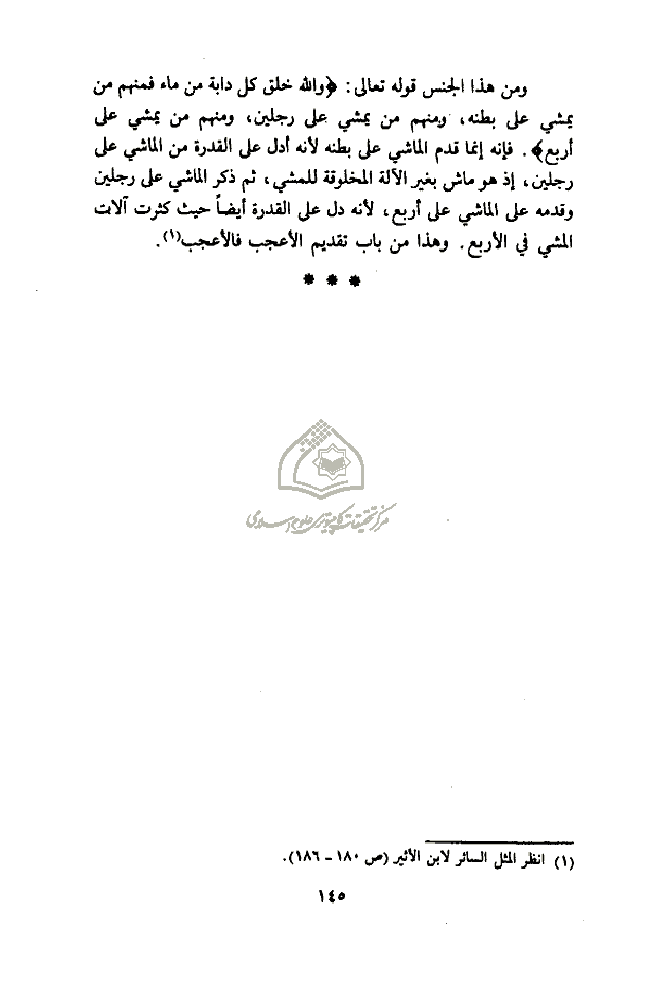 ومن هذا الجنس قوله تعالى: وَاللَّهُ خَلَقَ كُلَّ دَابَّةٍ مِنْ ماءٍ فَمِنْهُمْ مَنْ يَمْشِي عَلى بَطْنِهِ، وَمِنْهُمْ مَنْ يَمْشِي عَلى رِجْلَيْنِ، وَمِنْهُمْ مَنْ يَمْشِي عَلى أَرْبَعٍ.