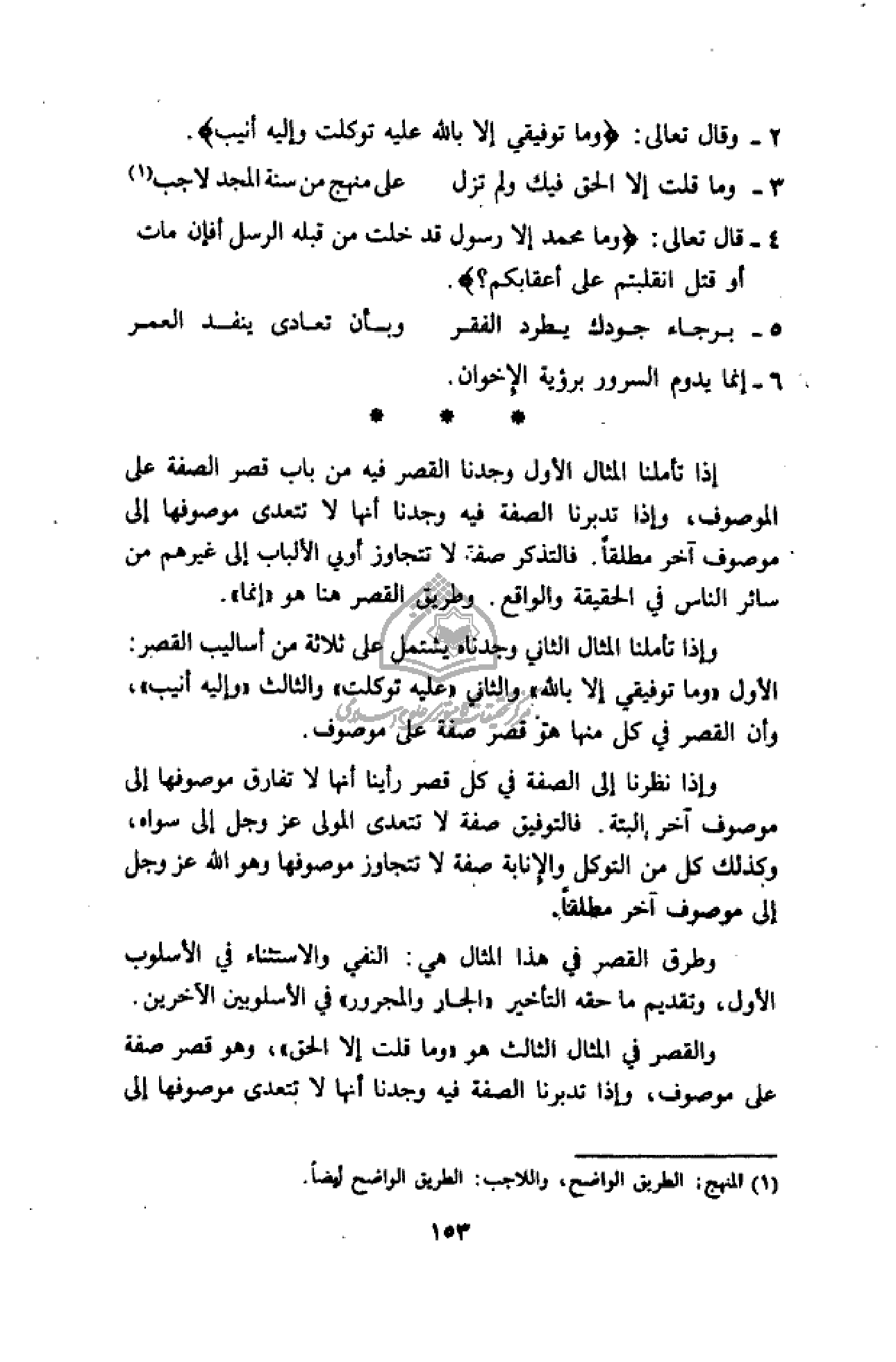 الأول «وما توفيقي إلا بالله» والثاني «عليه توكلت» والثالث «وإليه أنيب»، وأن القصر في كل منها هو قصر صفة على موصوف.