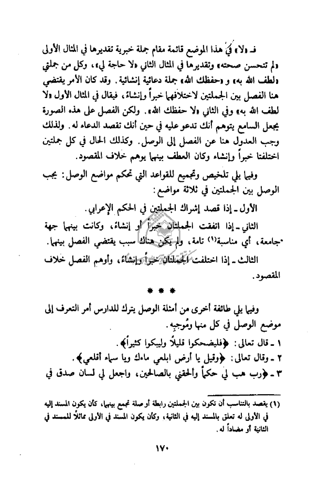 (¬1) يقصد بالتناسب أن تكون بين الجملتين رابطة أو صلة تجمع بينهما، كأن يكون المسند إليه في الأولى له تعلق بالمسند إليه في الثانية، وكأن يكون المسند في الأولى مماثلا للمسند في الثانية أو مضادا له.