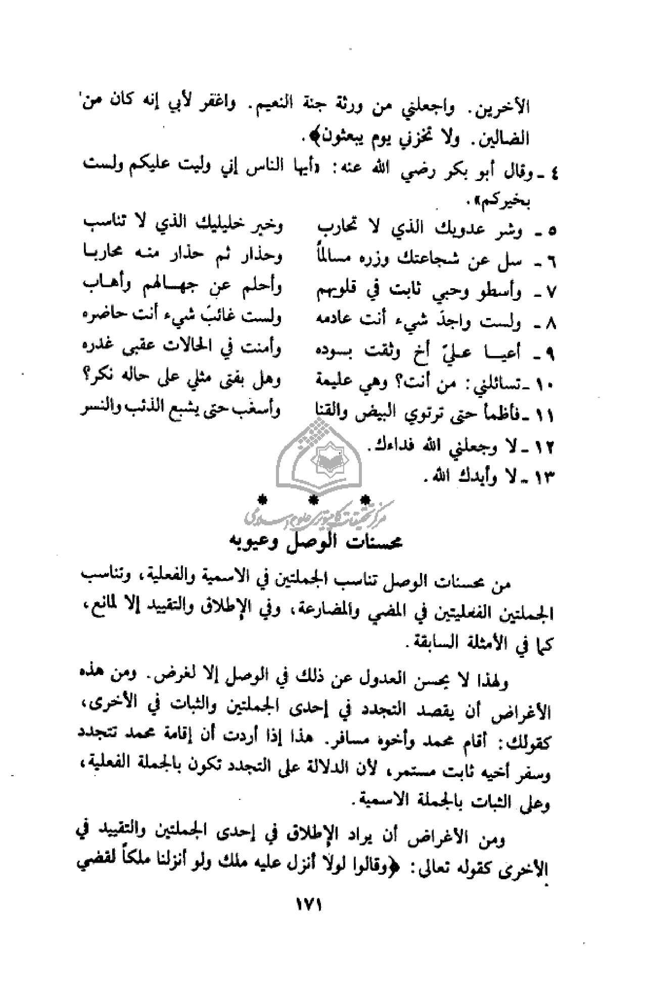 من محسنات الوصل تناسب الجملتين في الاسمية والفعلية، وتناسب الجملتين الفعليتين في المضي والمضارعة، وفي الإطلاق والتقييد إلا لمانع، كما في الأمثلة السابقة.